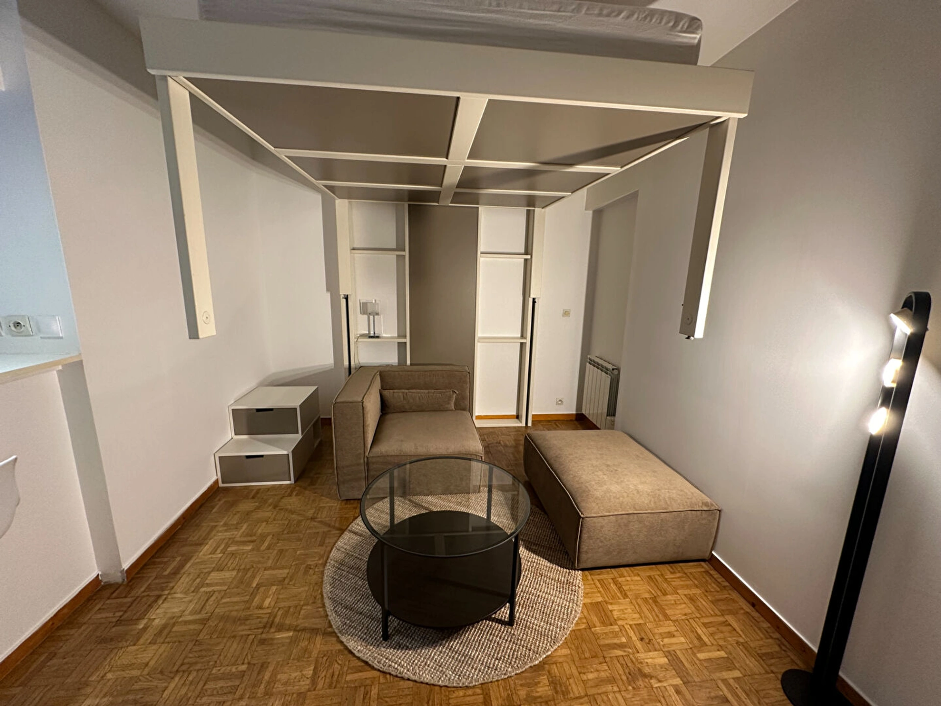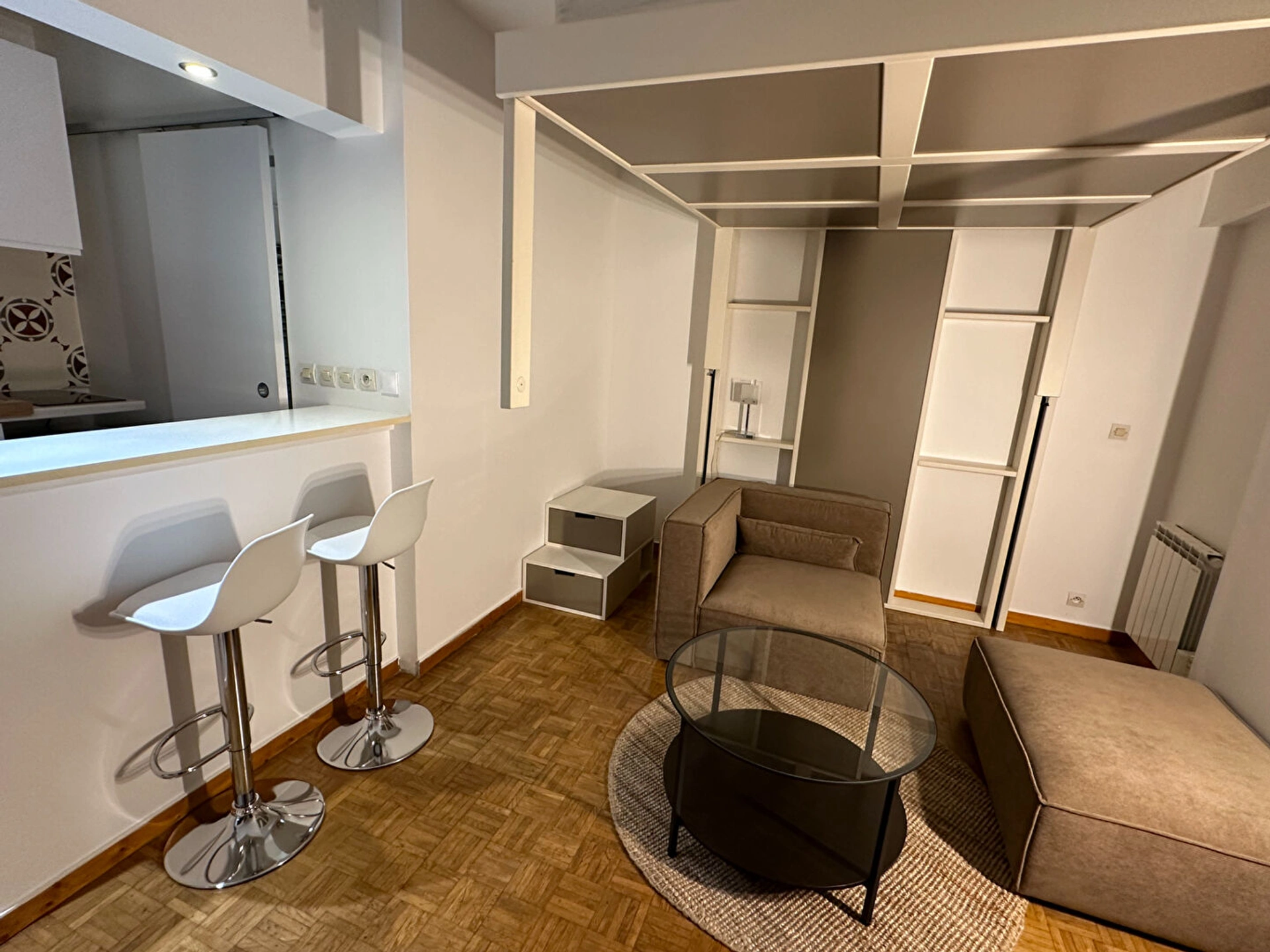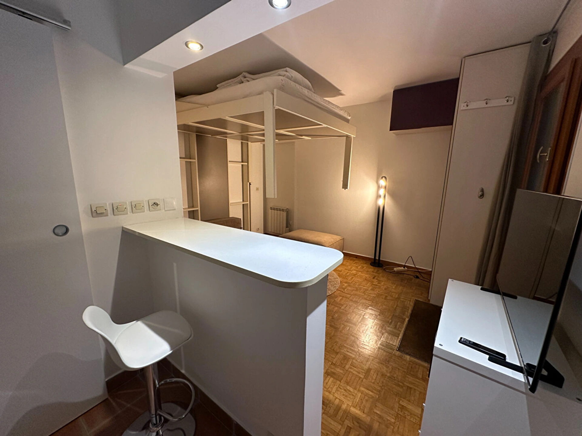 L'appartement comprend une belle pièce de vie avec un lit 2 places escamotable qui descend ou monte au plafond ce qui optimise l'espace et libère la surface au sol.