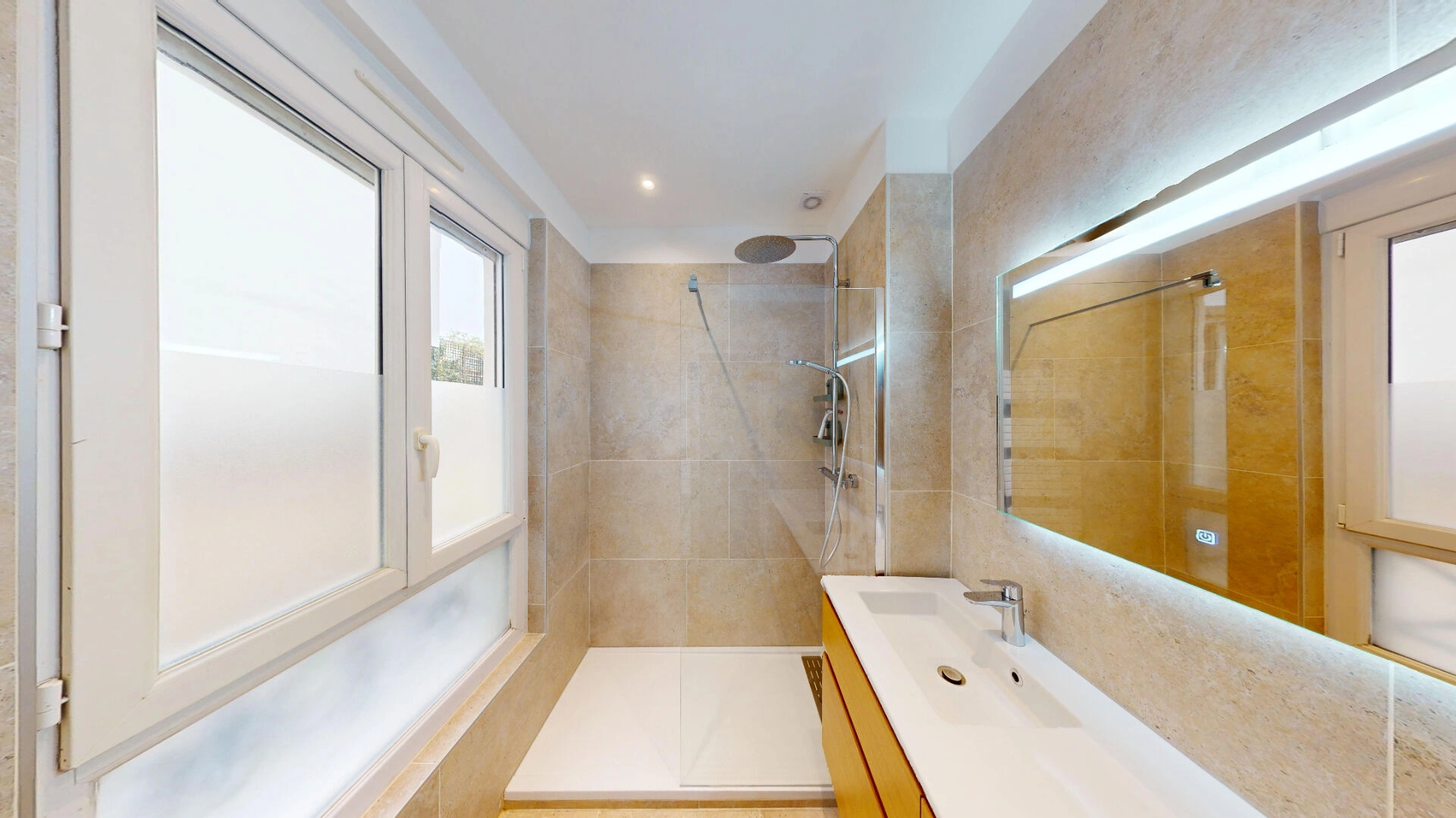 Il se compose d'une entrée avec de nombreux rangements, d'un séjour de 35 m² exposé Sud-Est avec une cuisine aménagée, équipée et ouverte, ainsi que de deux chambres d'environ 13 m² chacune. La salle d'eau a été entièrement rénovée. Les WC sont séparés.
