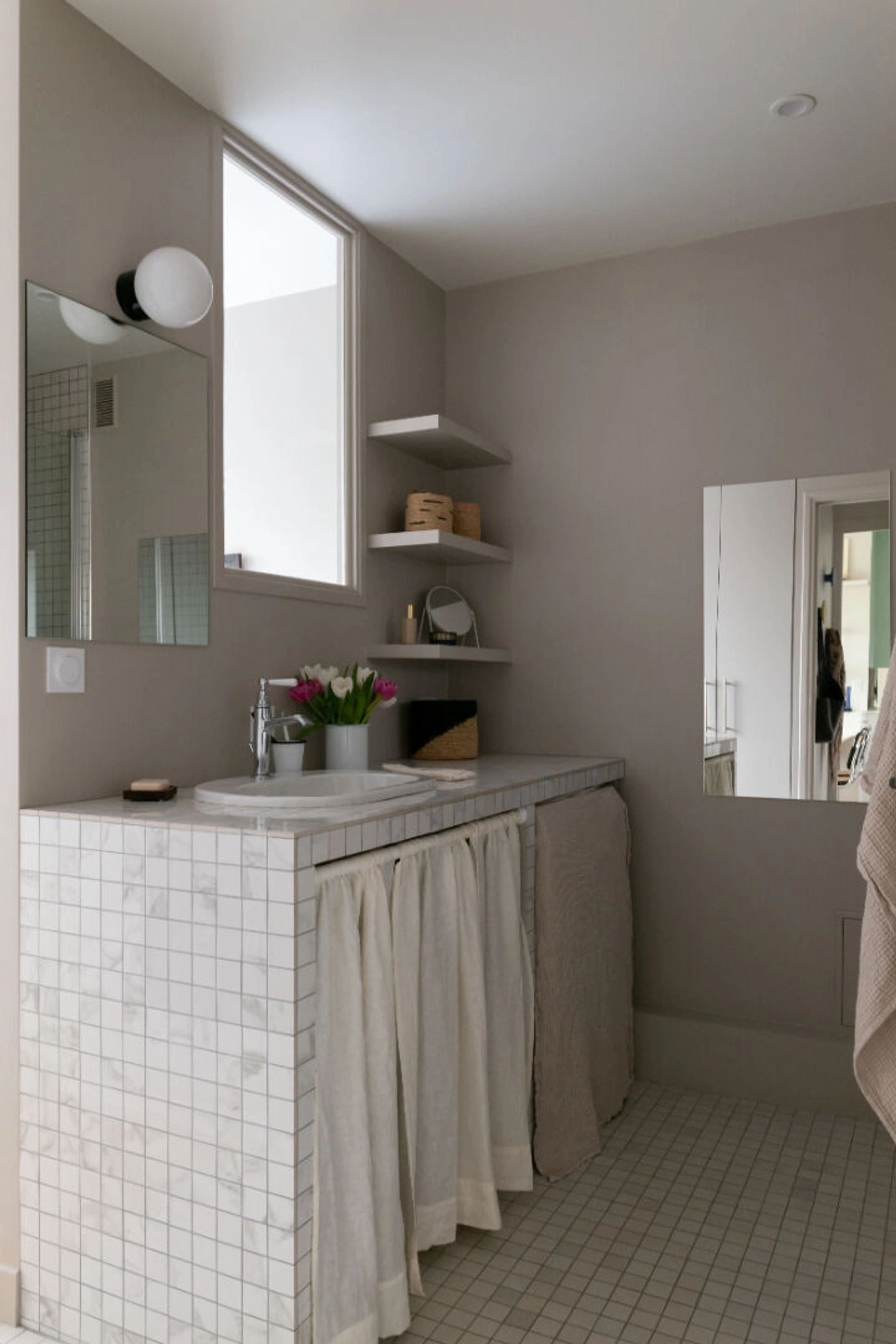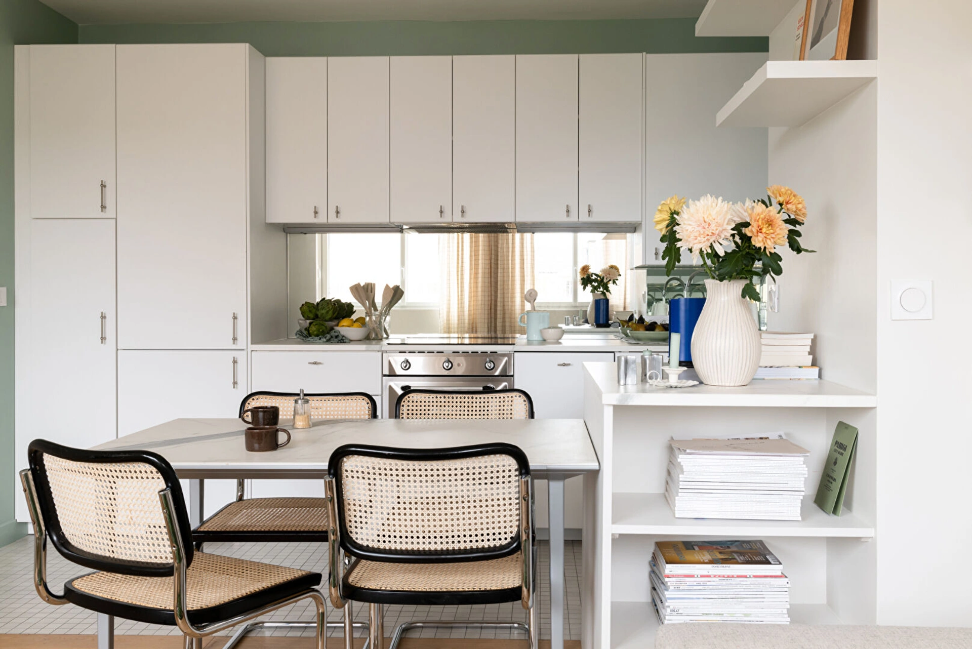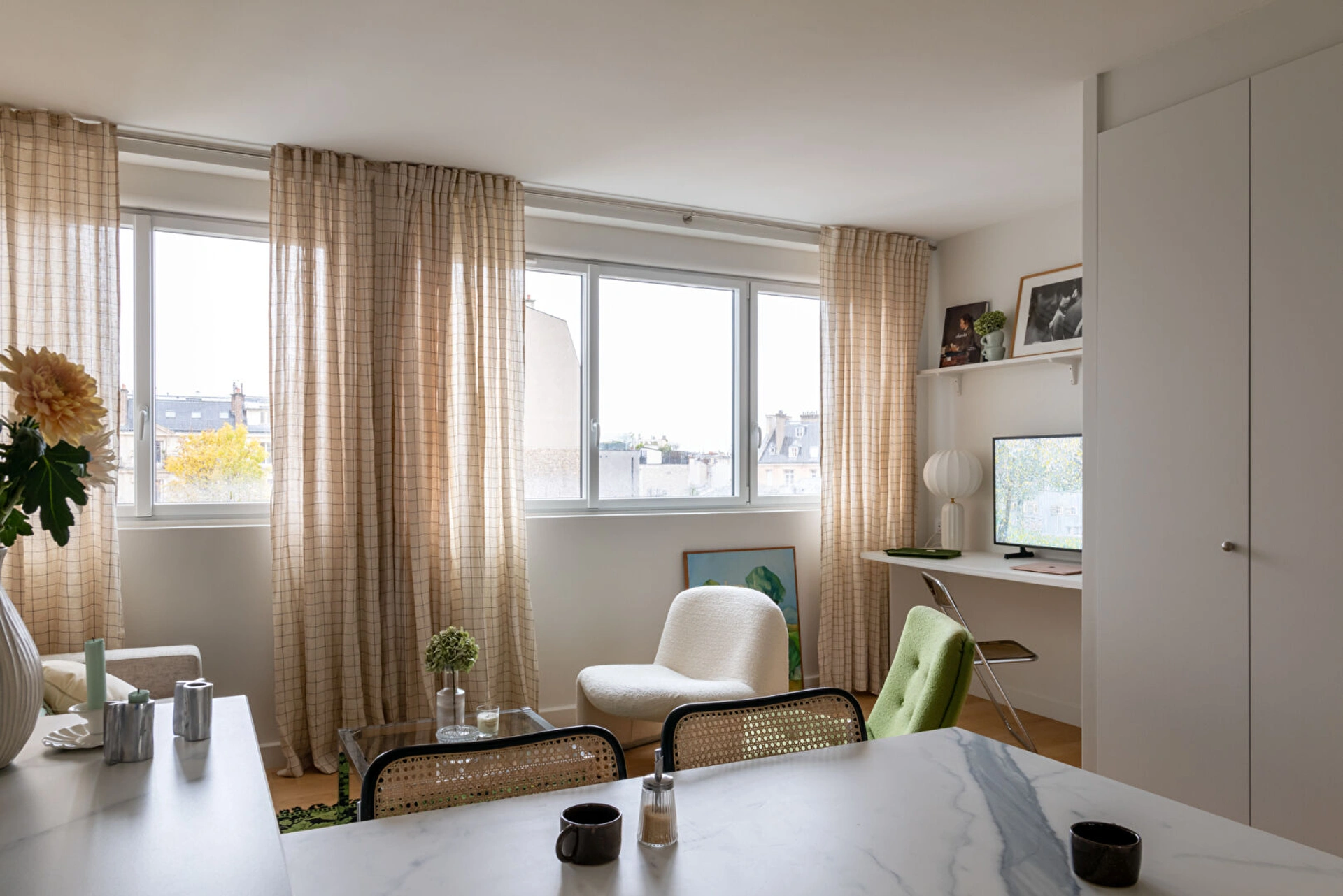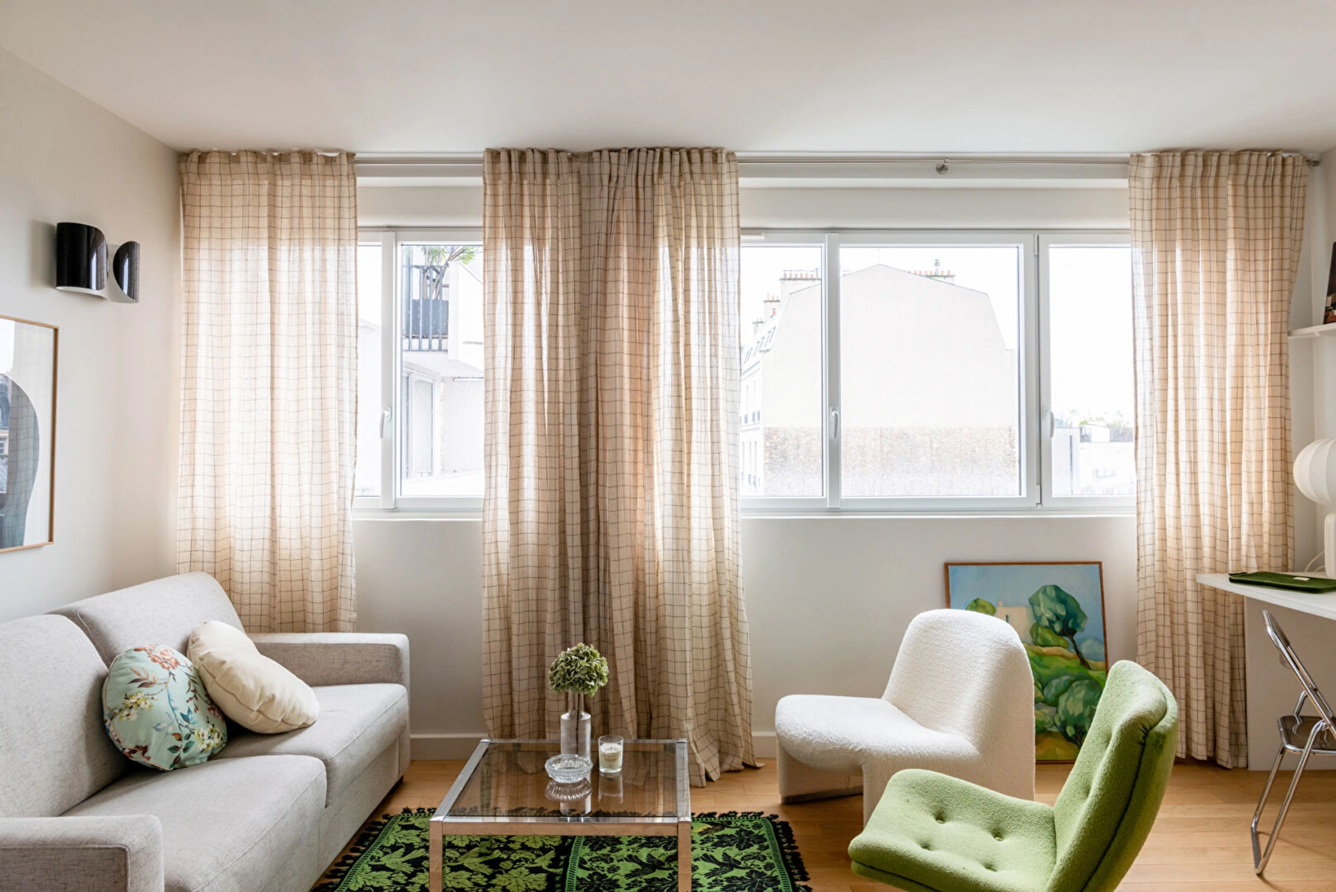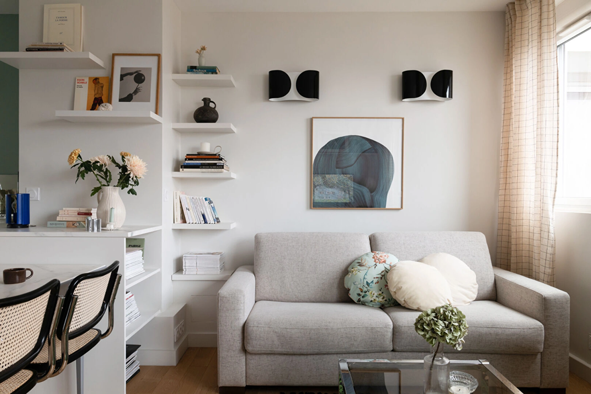 Appartement meublé avec goût, avec appliques Charlotte Perriand et Foglio, table basse Merci.