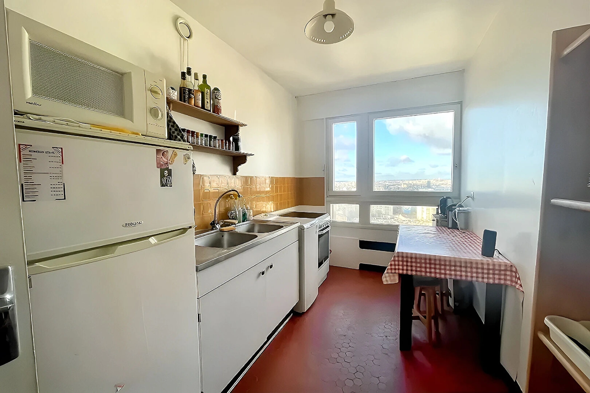 Il est composé d'une entrée avec placards, d'un séjour avec vue sur les toits de Paris, d'une cuisine indépendant avec possibilité d'ouverture sur le séjour, de deux chambres, d'une salle de bains et d'un WC séparés.