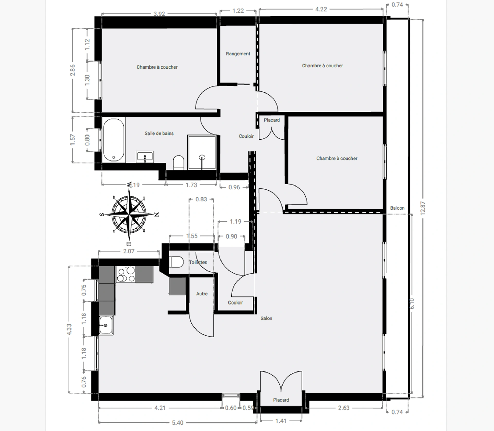 L'appartement se compose d'une entrée qui mène à un séjour spacieux de 45m² avec cuisine ouverte aménagée et équipée, trois chambres, un dressing, une salle de bain comprenant douche, baignoire et wc, une buanderie, un wc séparé et de nombreux espaces de rangement.