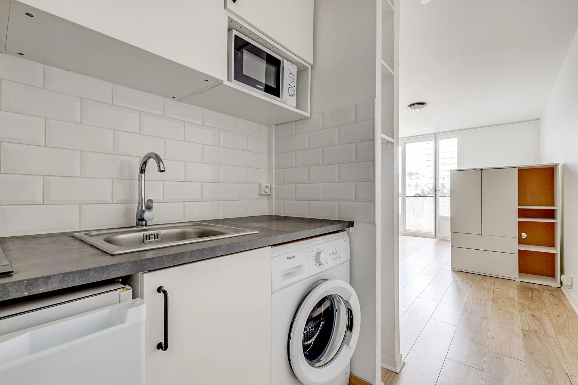 Le bien dispose d'une pièce de vie principale avec coin cuisine équipée, salle d'eau avec WC, et un balcon.