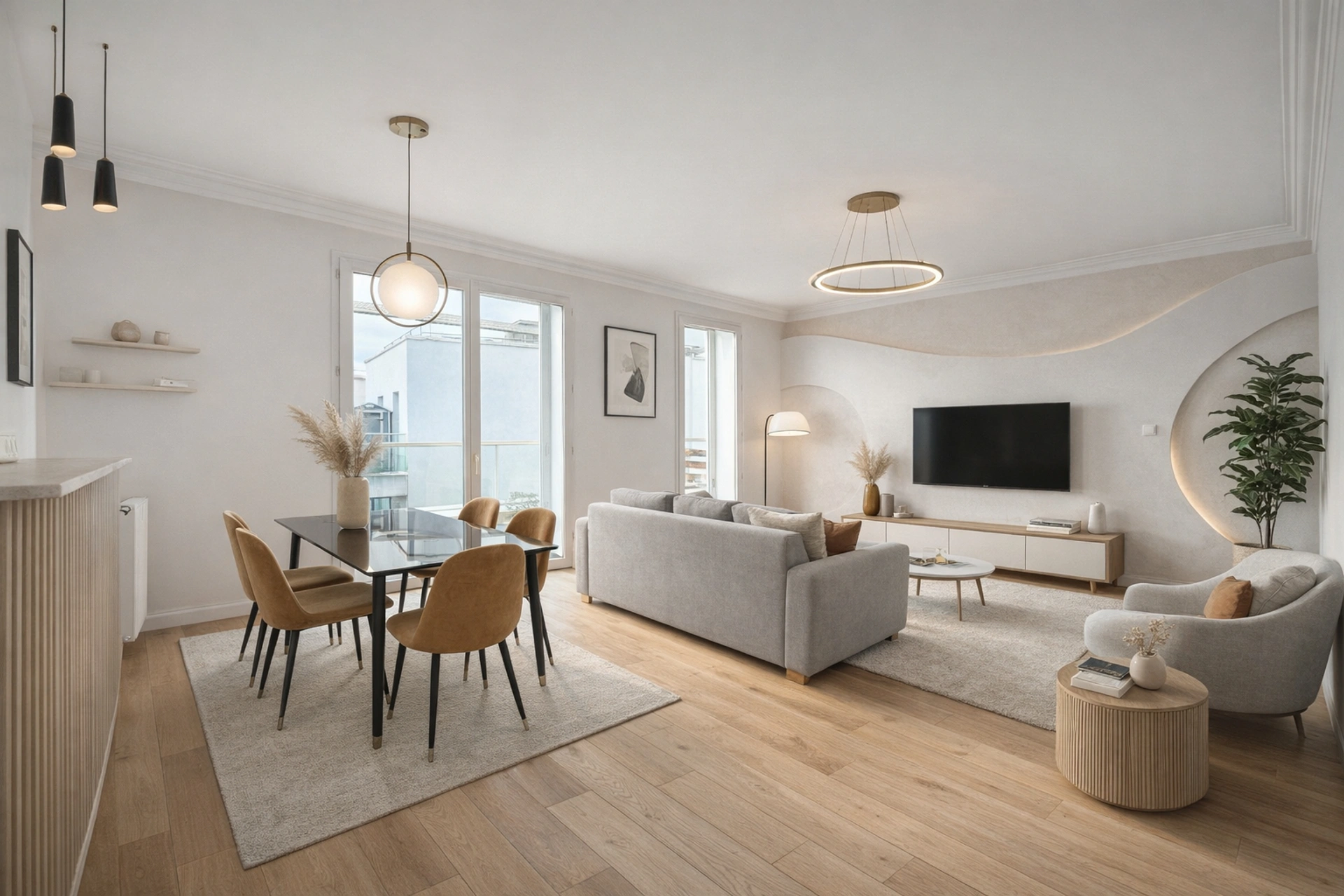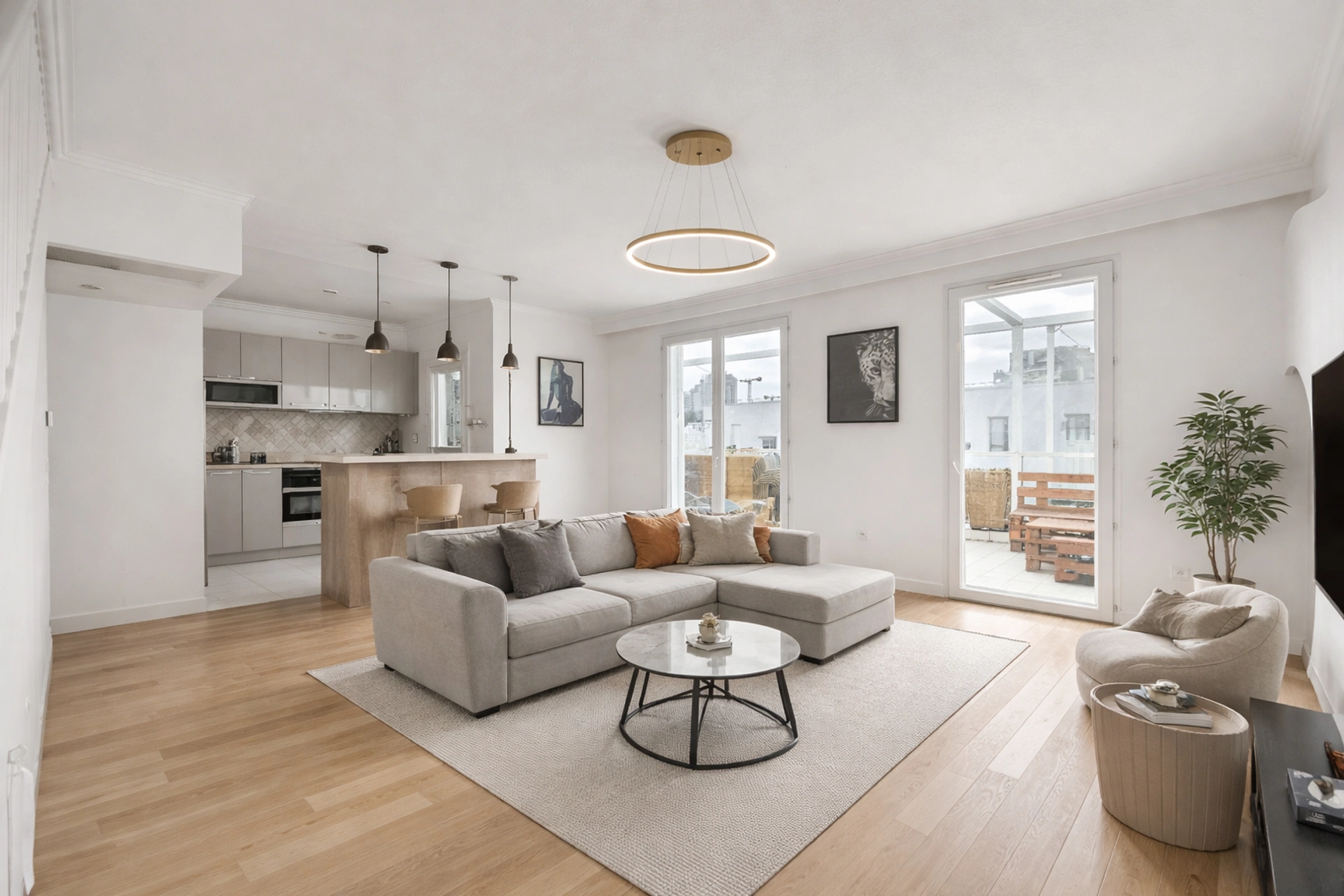 L'appartement se compose d'un séjour spacieux de plus de 34 m², baigné de lumière, ouvrant sur une terrasse de 16 m², idéale pour les moments de détente. La cuisine américaine s'intègre parfaitement à l'espace de vie. L'ensemble est complété par trois chambres, deux salles de bain, deux toilettes séparés et une entrée avec rangements.