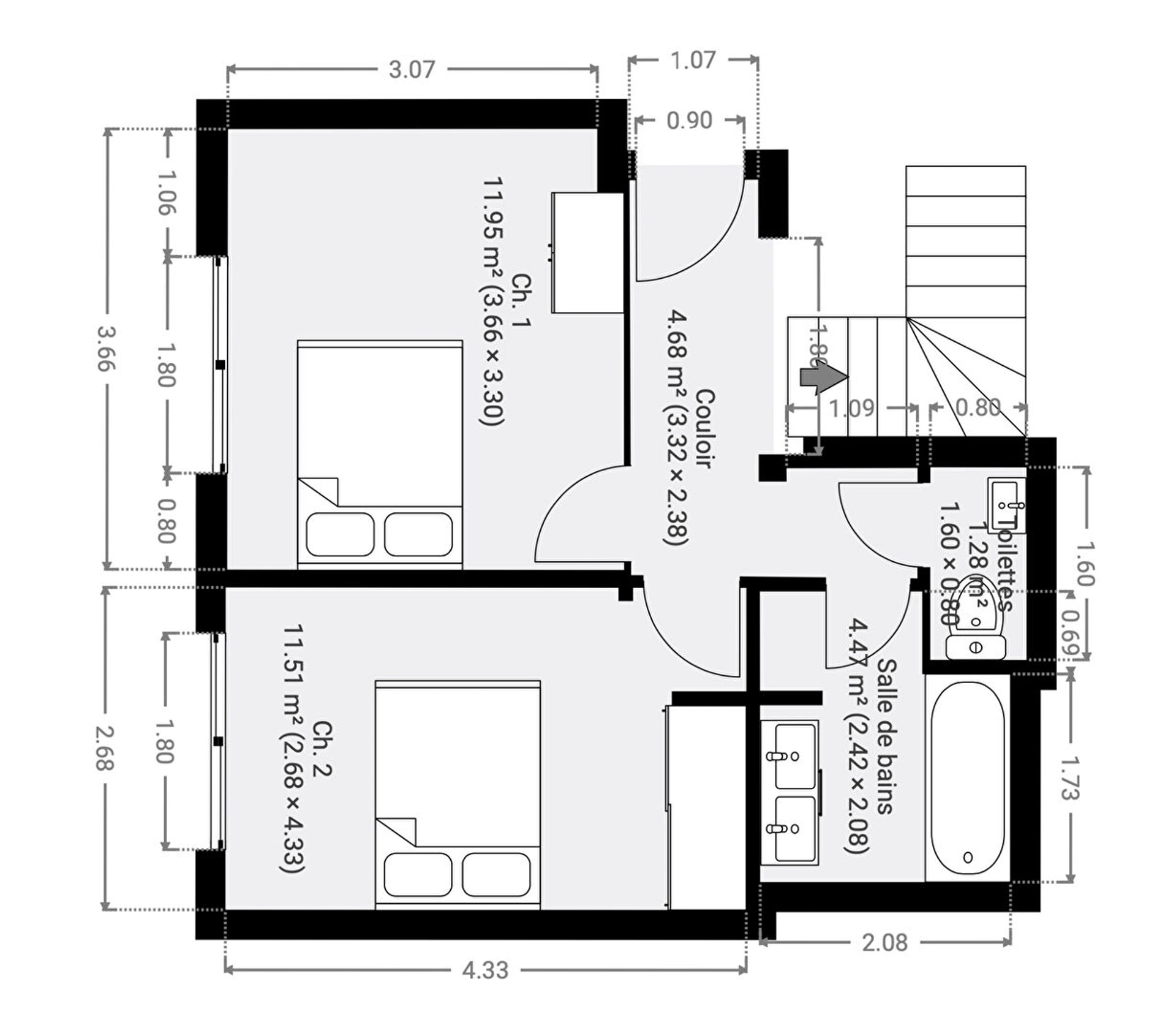 A l'étage supérieur, un espace nuit dédié à la famille distribue deux grandes chambres lumineuses, une salle de bains ainsi qu'un WC séparé.