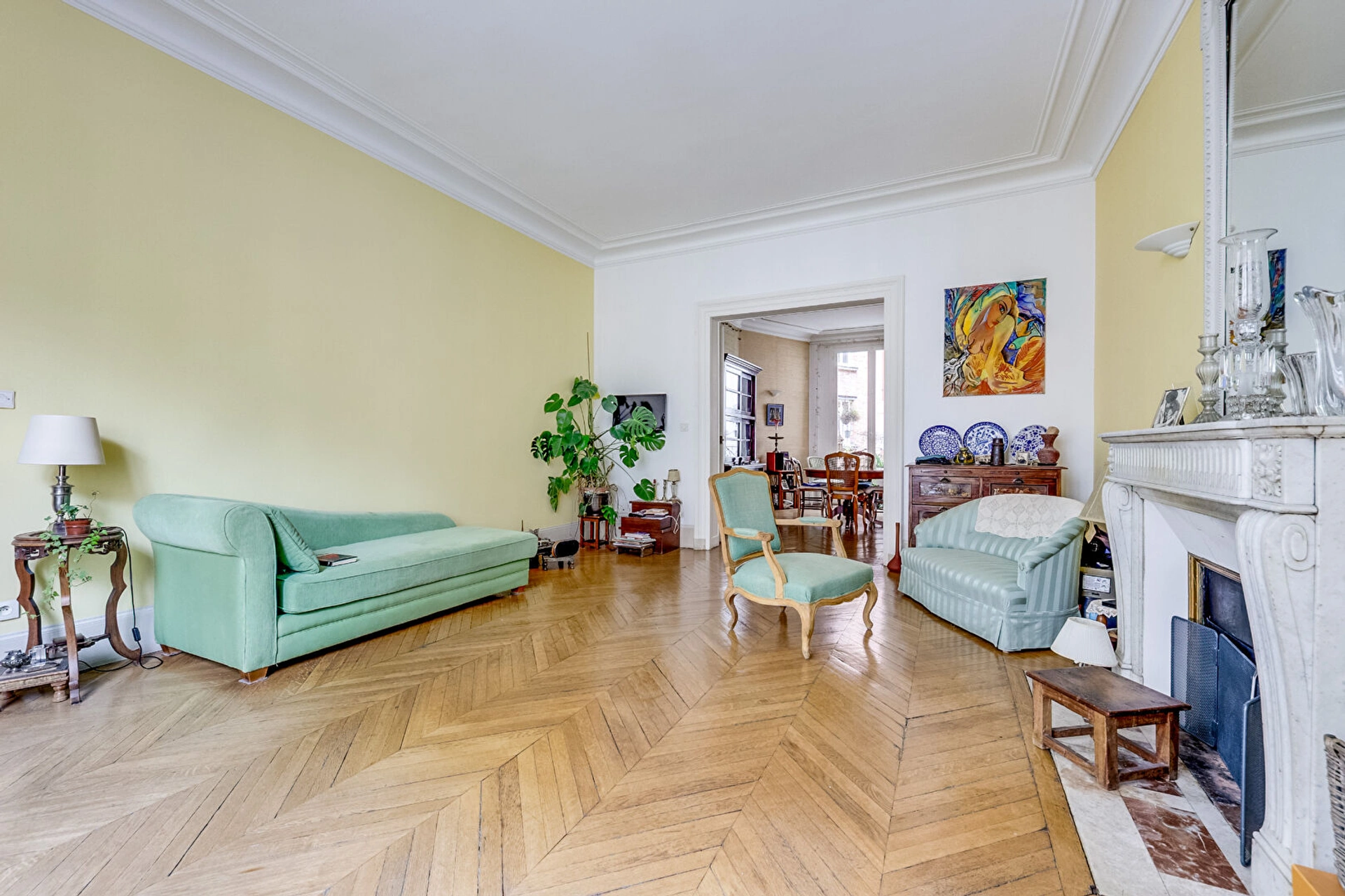 Calme et lumineux, bénéficiant d'un plan modulable, cet appartement séduit par le charme de l'ancien parisien : très belle hauteur sous plafond, moulures, parquet en point de Hongrie et cheminées en marbre.