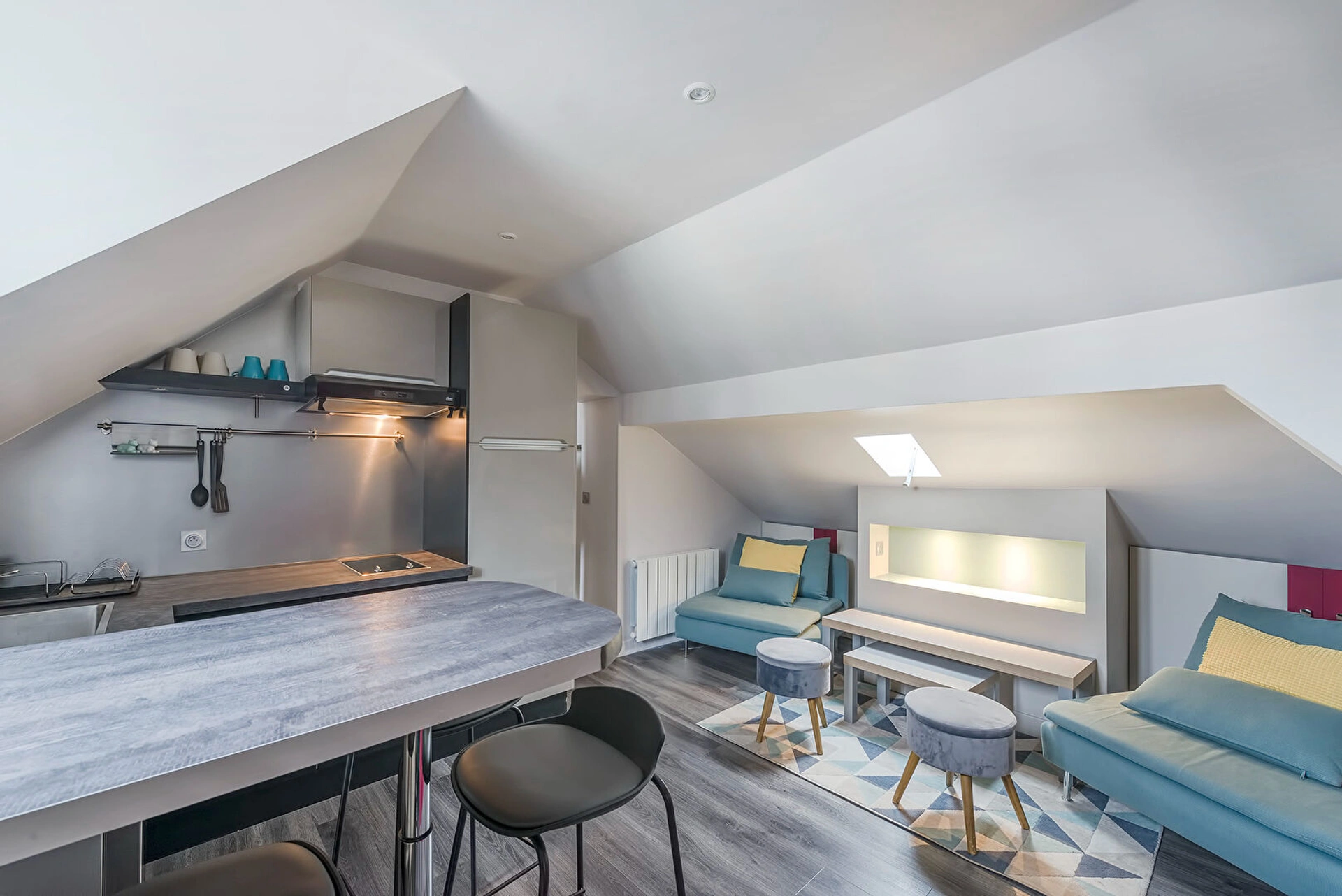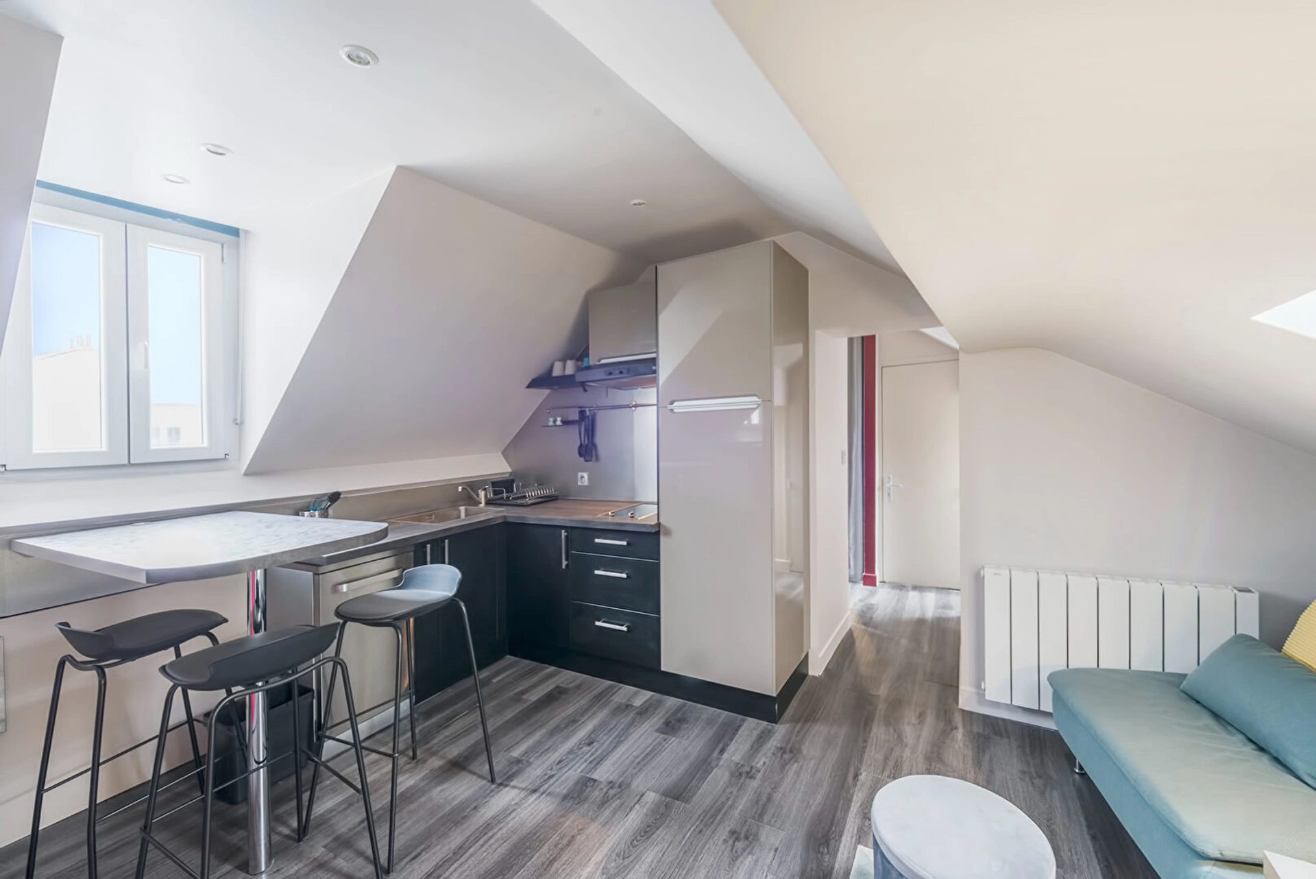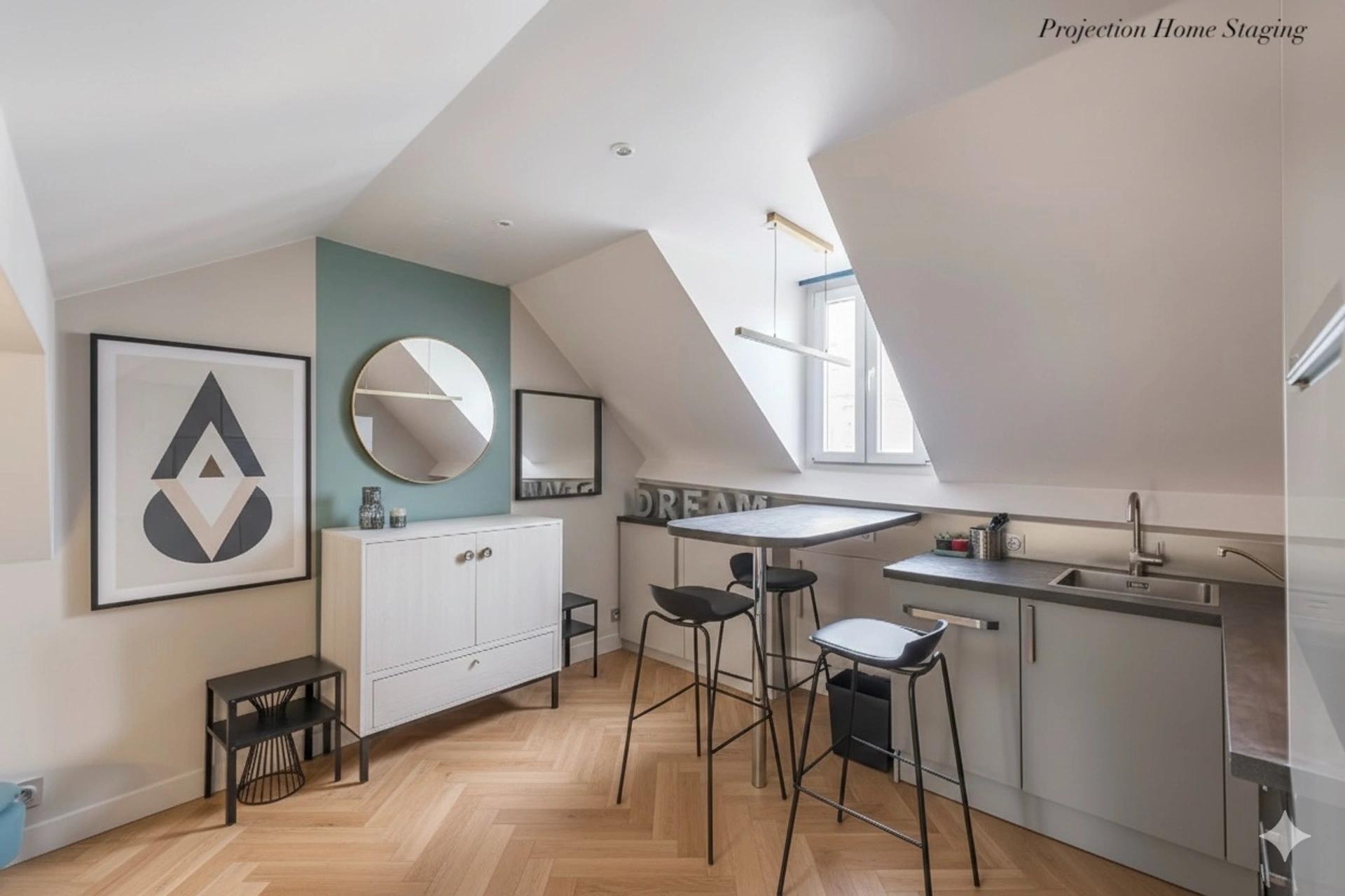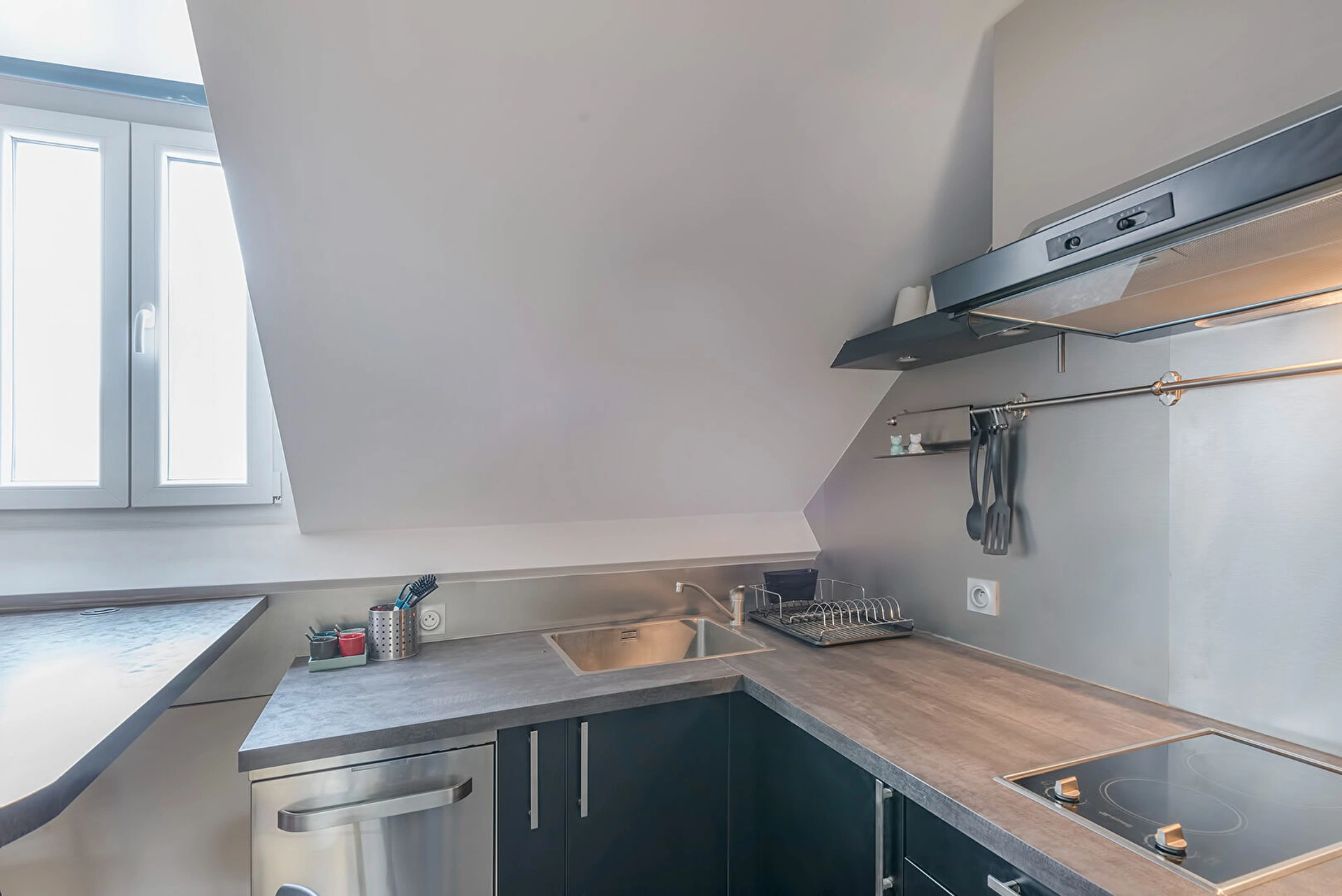 Niché au 5ème étage d'un immeuble ancien sans ascenseur, ce bien rare se compose d'une entrée, d'un séjour avec coin cuisine, aménagée et équipée, bénéficiant d'une magnifique vue sur les toits de Paris et sur l'Hôtel de Ville. Il comprend également une chambre cosy avec sa salle d'eau et ses WC attenants.