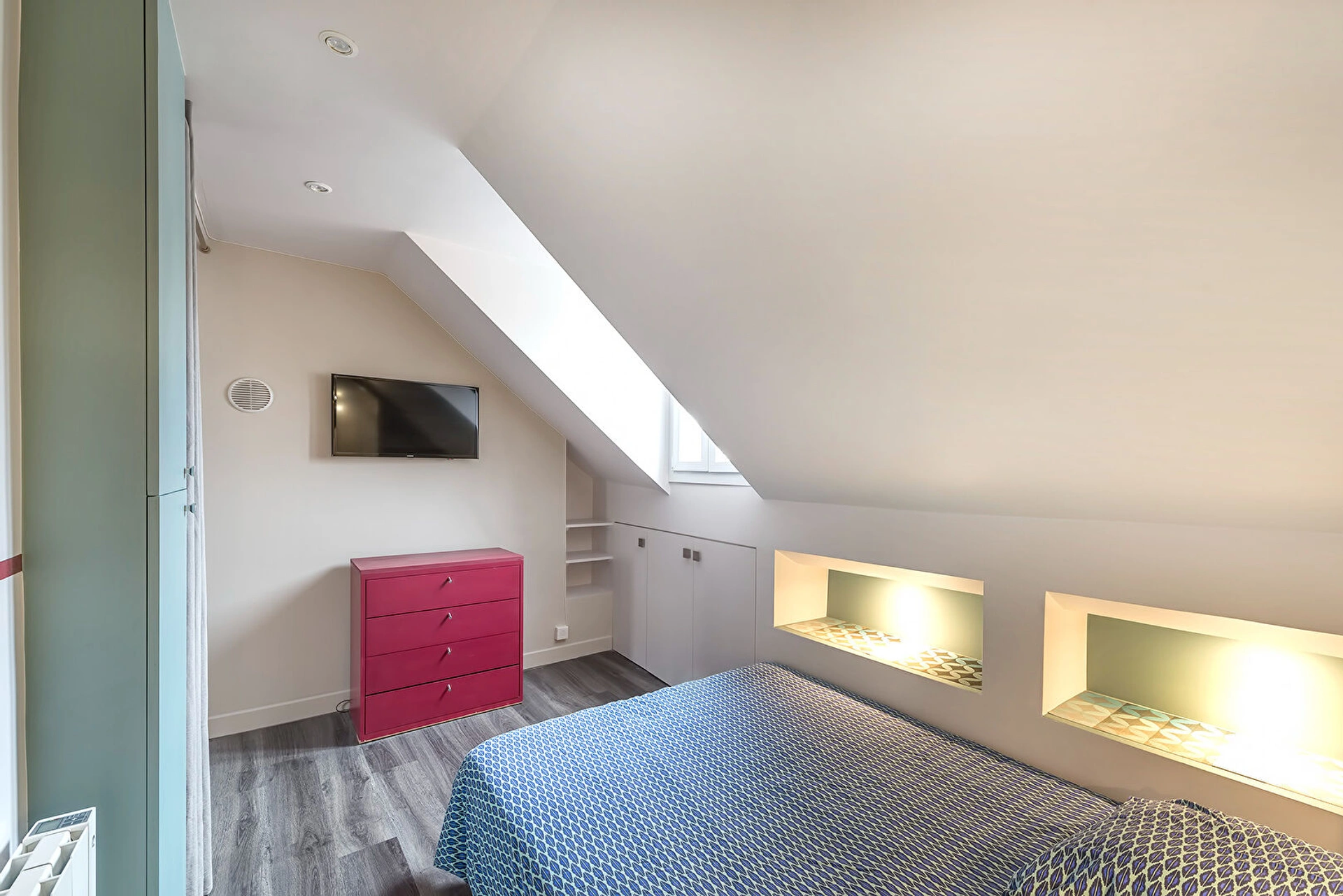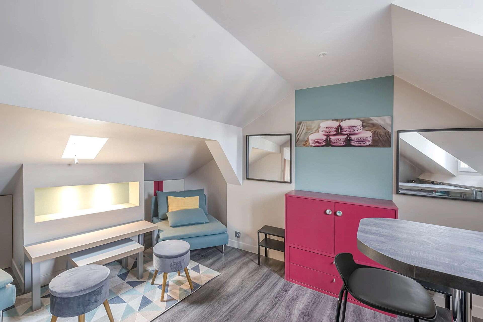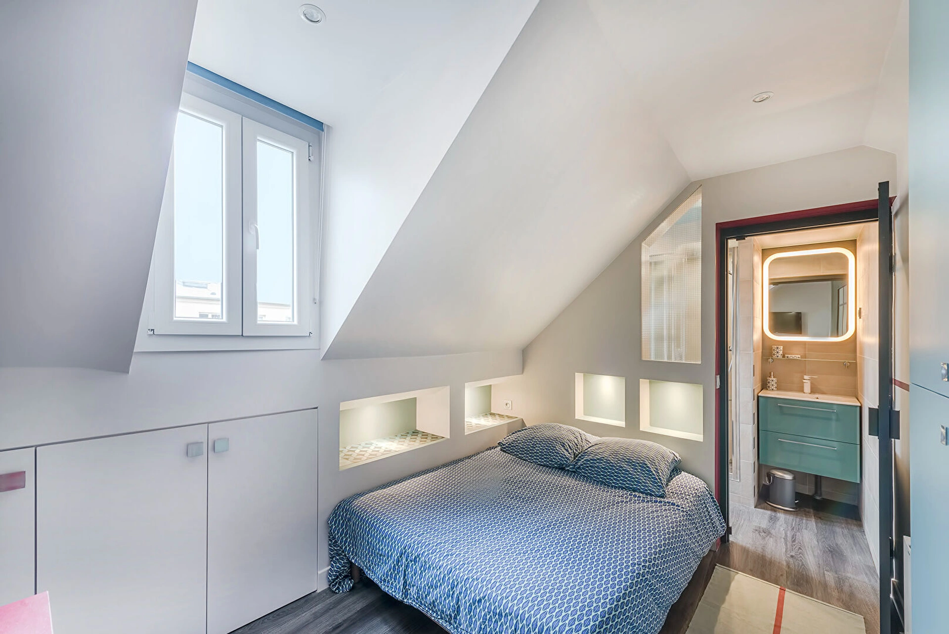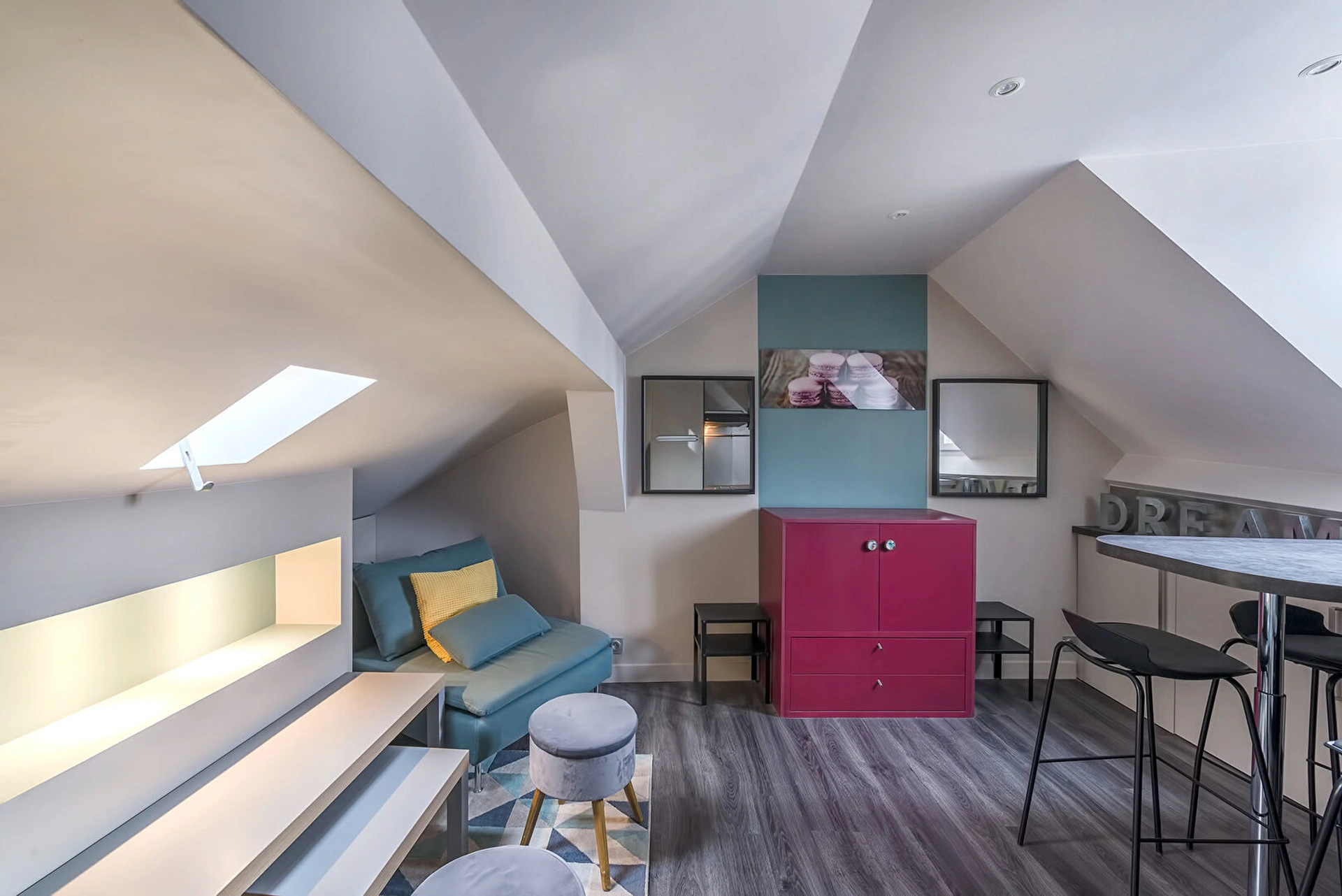 Niché au 5ème étage d'un immeuble ancien sans ascenseur, ce bien rare se compose d'une entrée, d'un séjour avec coin cuisine, aménagée et équipée, bénéficiant d'une magnifique vue sur les toits de Paris et sur l'Hôtel de Ville. Il comprend également une chambre cosy avec sa salle d'eau et ses WC attenants.
