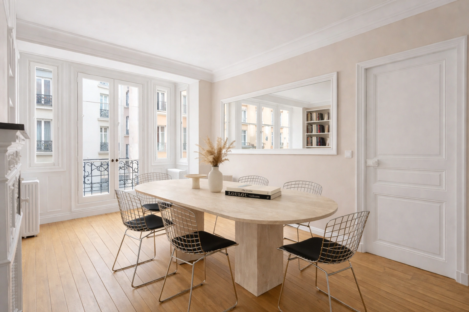 L'appartement est calme et lumineux grâce à sa double exposition. Il dévoile le charme d'une architecture haussmannienne : beaux volumes, parquet ancien, moulures, belle hauteur sous plafond, bow windows