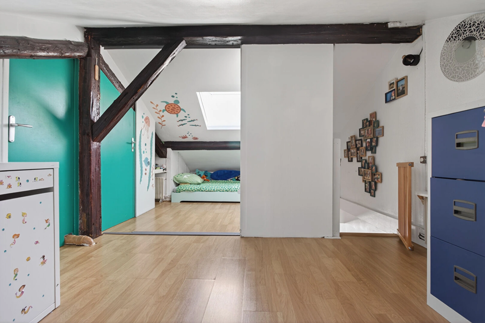 Il se compose d'un séjour lumineux, d'une cuisine indépendante aménagée et équipée, d'une chambre ainsi que d'une salle de bain avec WC. Un escalier intérieur vous mène aux combles aménagés, véritables espaces de vie supplémentaires, accueillant aujourd'hui deux chambres d'enfants et un bureau; un cadre idéal pour une vie de famille ou le télétravail.