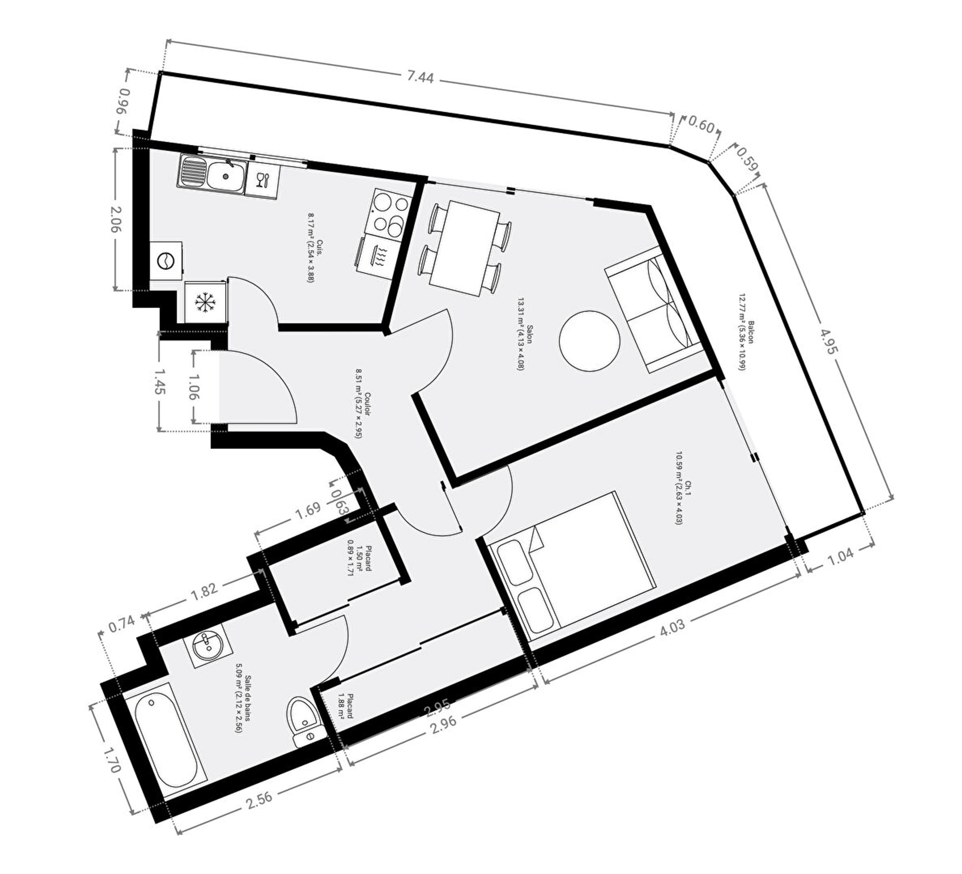 L'appartement se compose d'un séjour lumineux ouvrant sur le balcon, d'une cuisine indépendante aménagée et équipée, d'une chambre, d'une salle de bains avec WC.