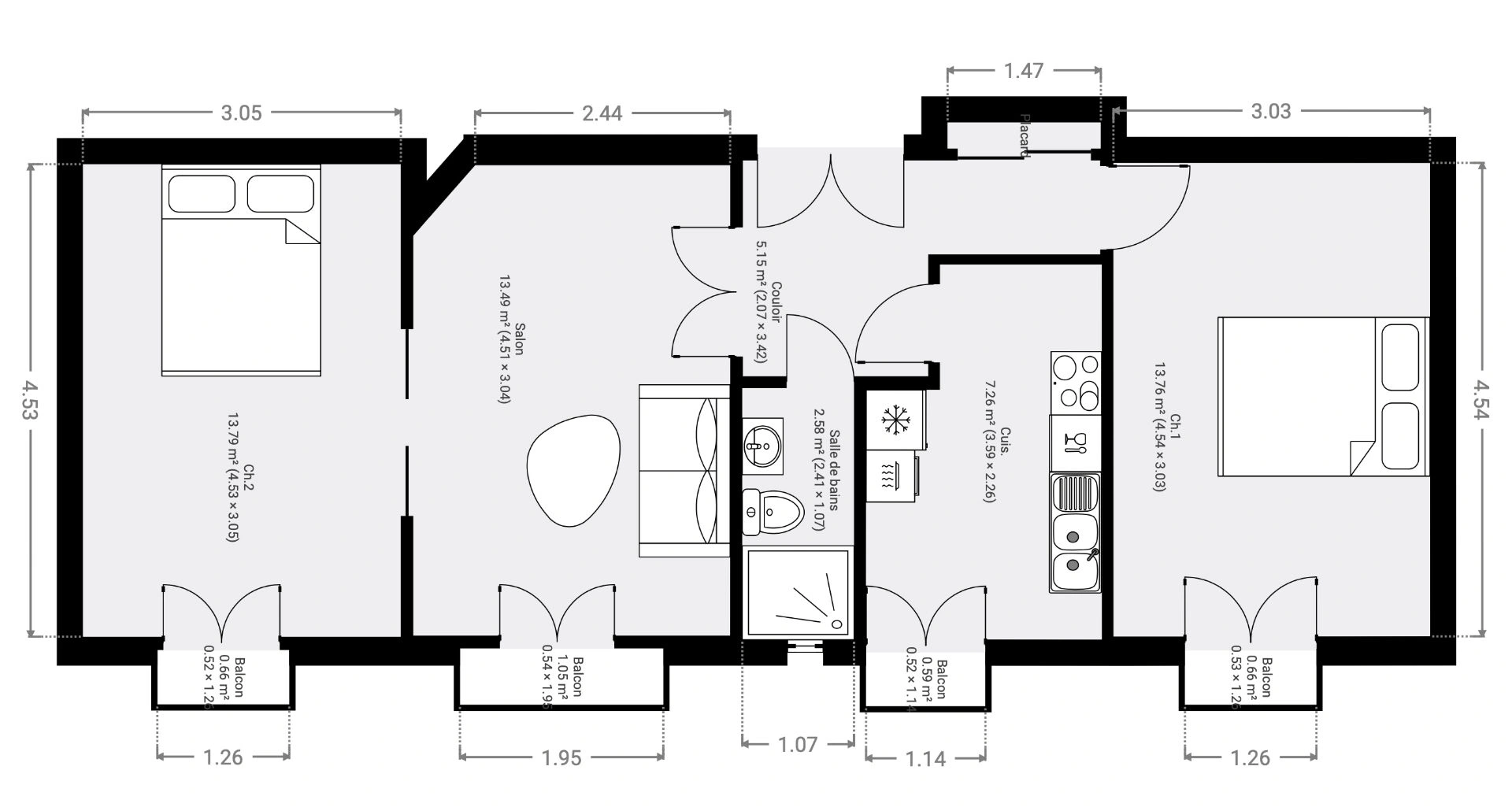Il se compose d'une pièce de vie lumineuse, d'une cuisine séparée, de deux chambres confortables, ainsi que d'une salle d'eau avec toilettes.