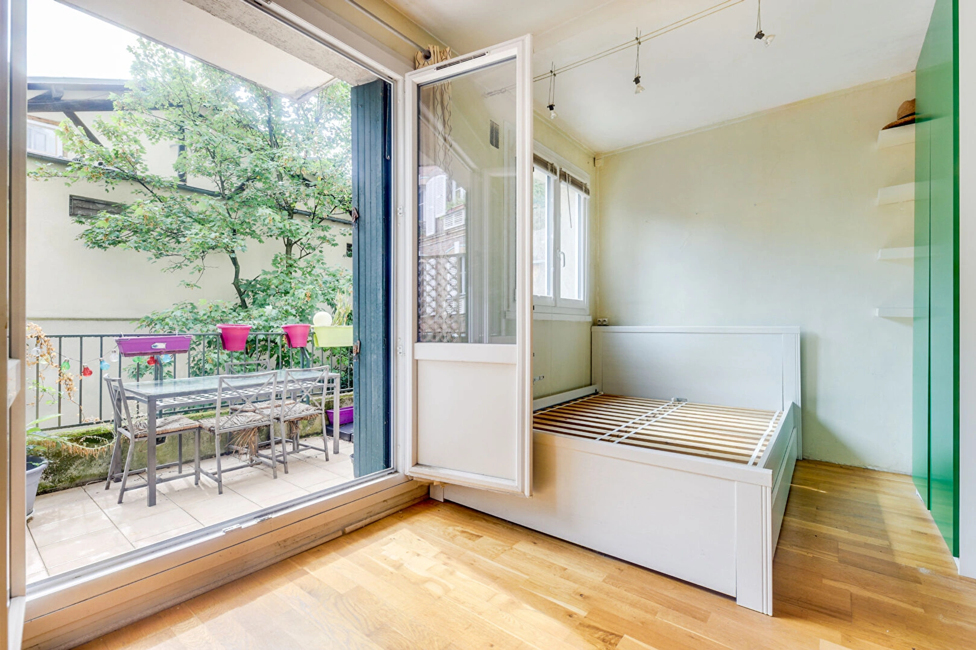 Entièrement sur cour, le bien se compose d'une entrée, d'une pièce de vie principale avec cuisine ouverte aménagée équipée et un renfoncement pour le coin nuit, une grande terrasse exposée plein SUD et sans vis-à-vis donnant sur la cour arborée de l'immeuble, et une salle d'eau avec WC.