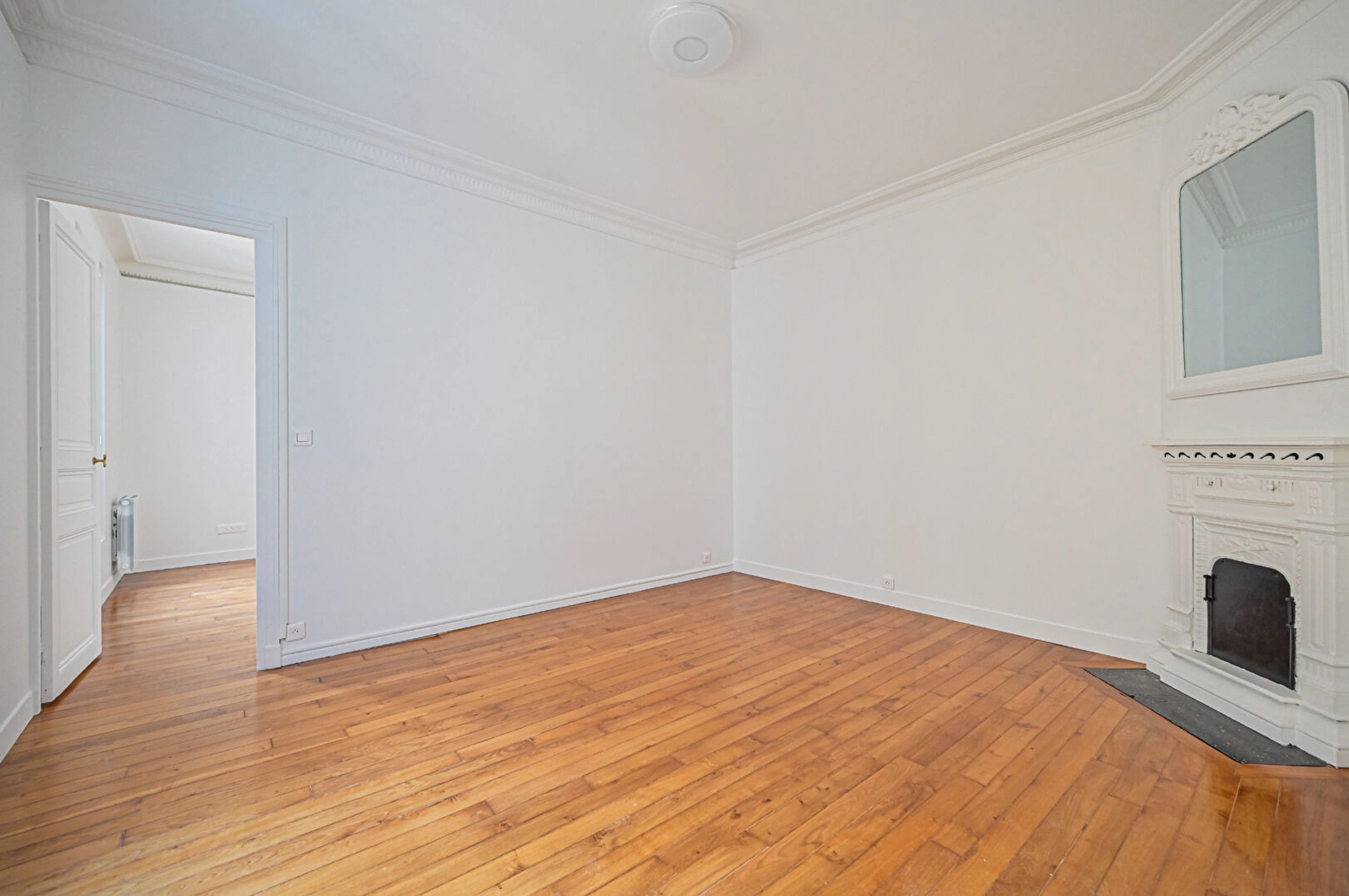 Charme de l'ancien préservé : parquet, moulures, cheminée.