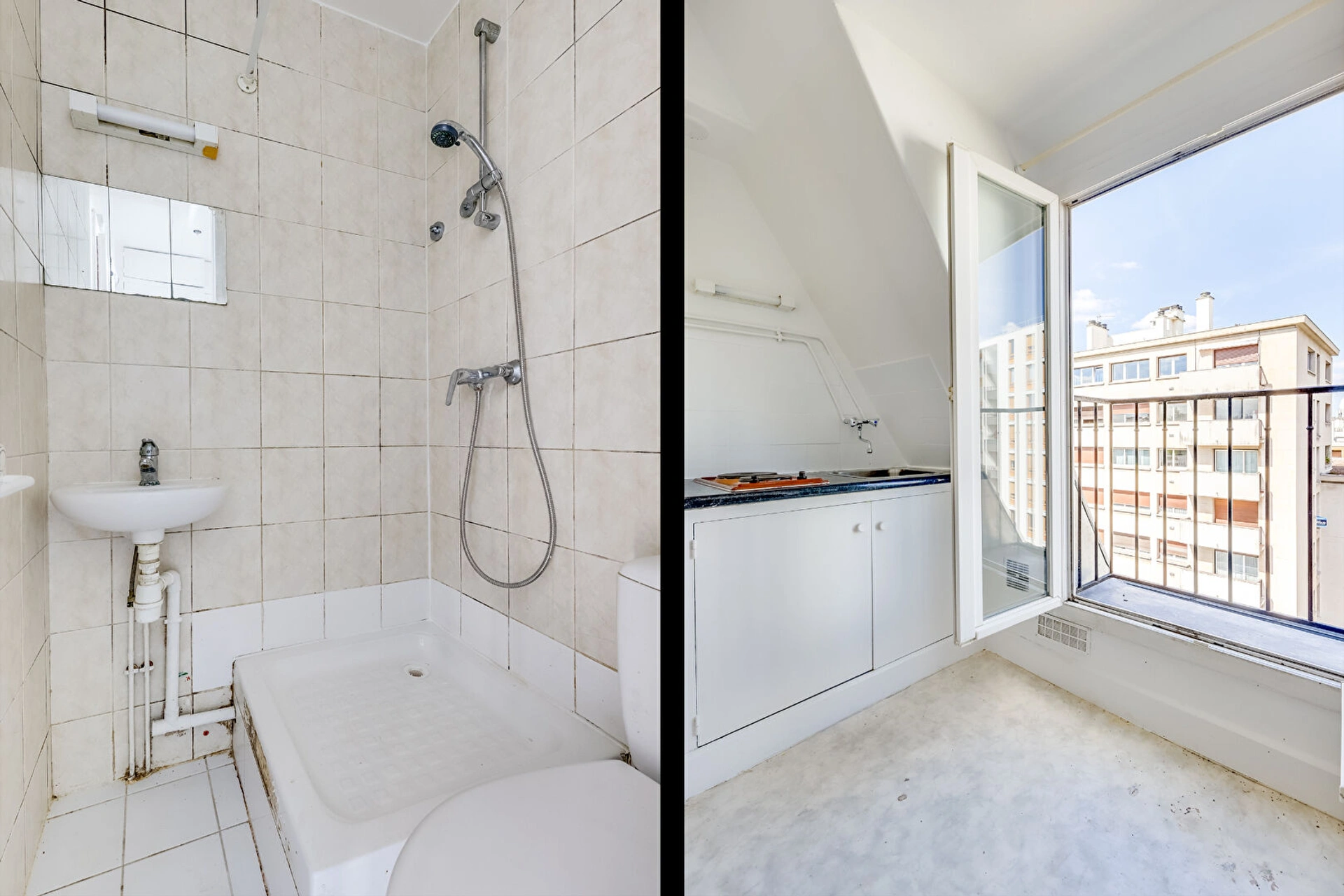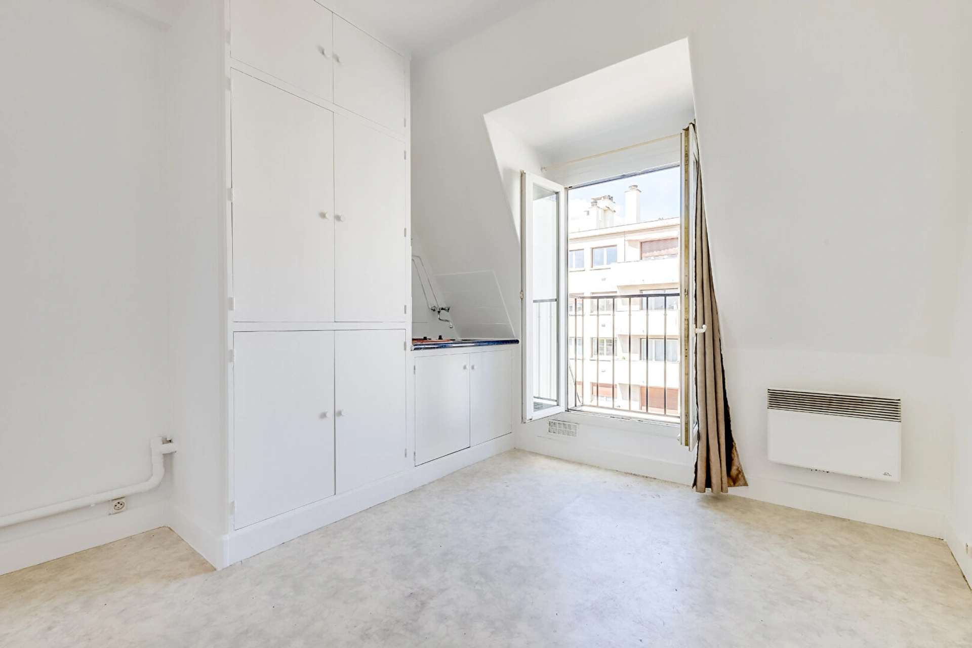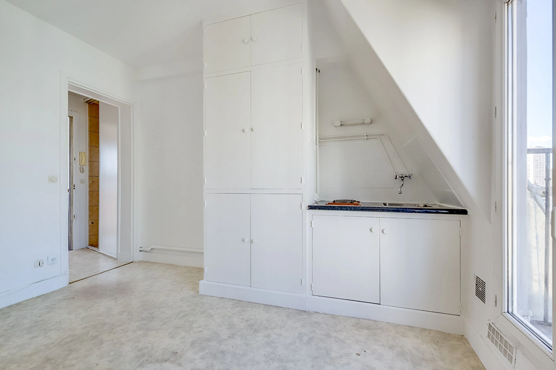 Situé au 6e et dernier étage SANS ASCENSEUR, il se compose d'une entrée avec rangements, d'une pièce de vie avec kitchenette ouvrant sur un balconnet exposé PLEIN OUEST sans vis-à-vis et d'une salle d'eau avec VRAI WC.