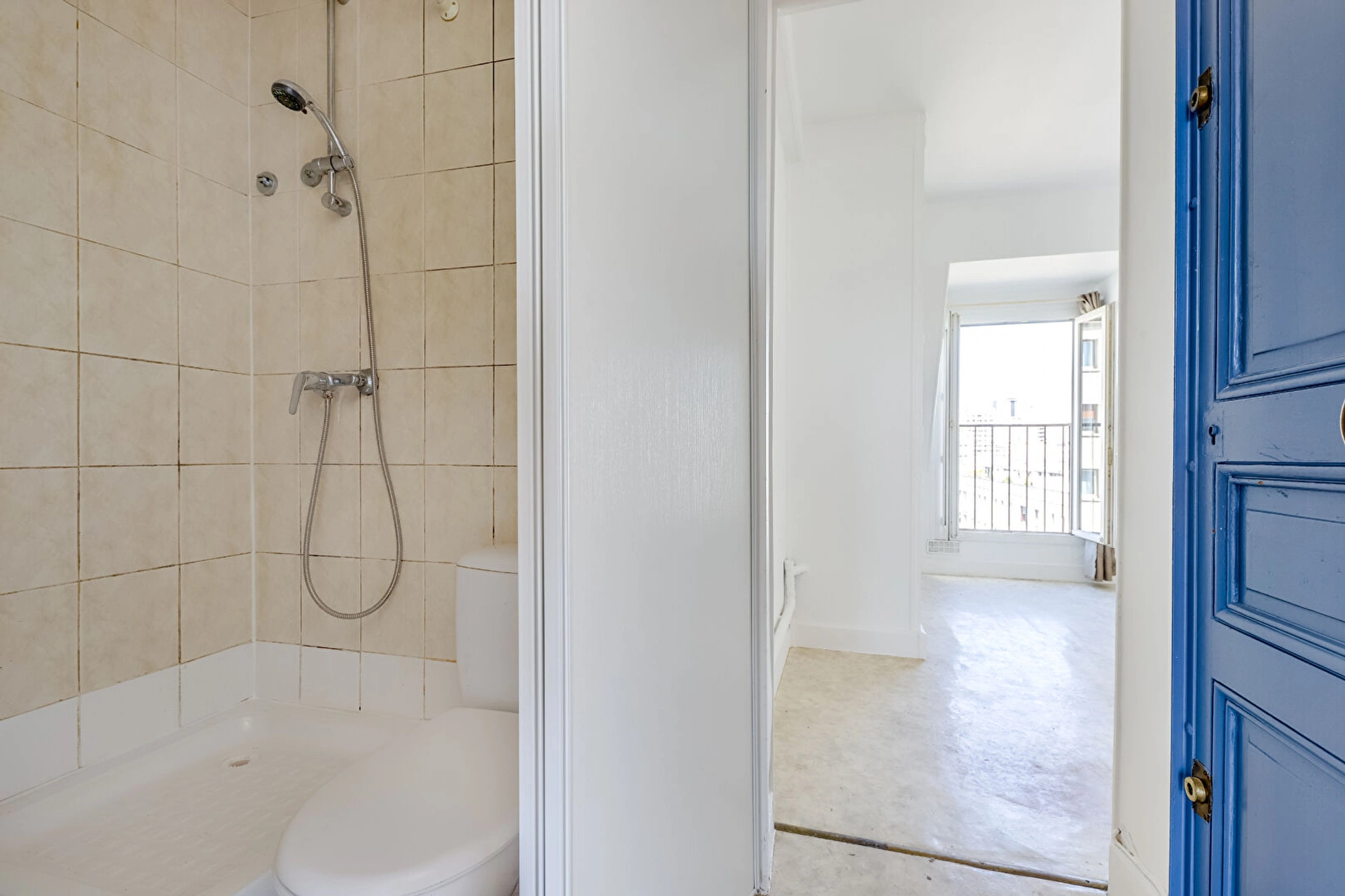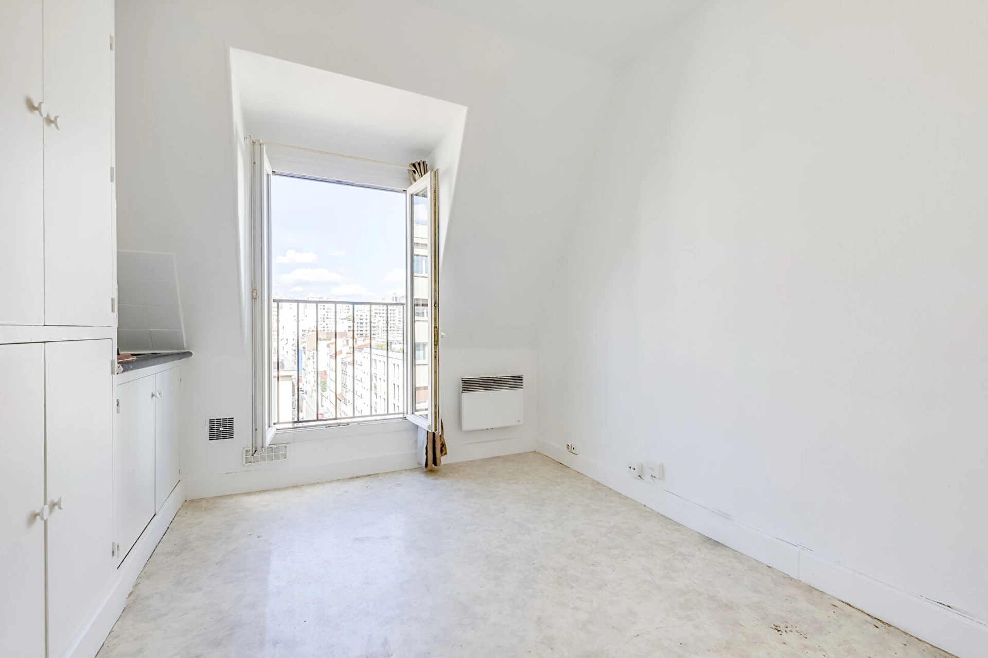 Situé au 6e et dernier étage SANS ASCENSEUR, il se compose d'une entrée avec rangements, d'une pièce de vie avec kitchenette ouvrant sur un balconnet exposé PLEIN OUEST sans vis-à-vis et d'une salle d'eau avec VRAI WC.
