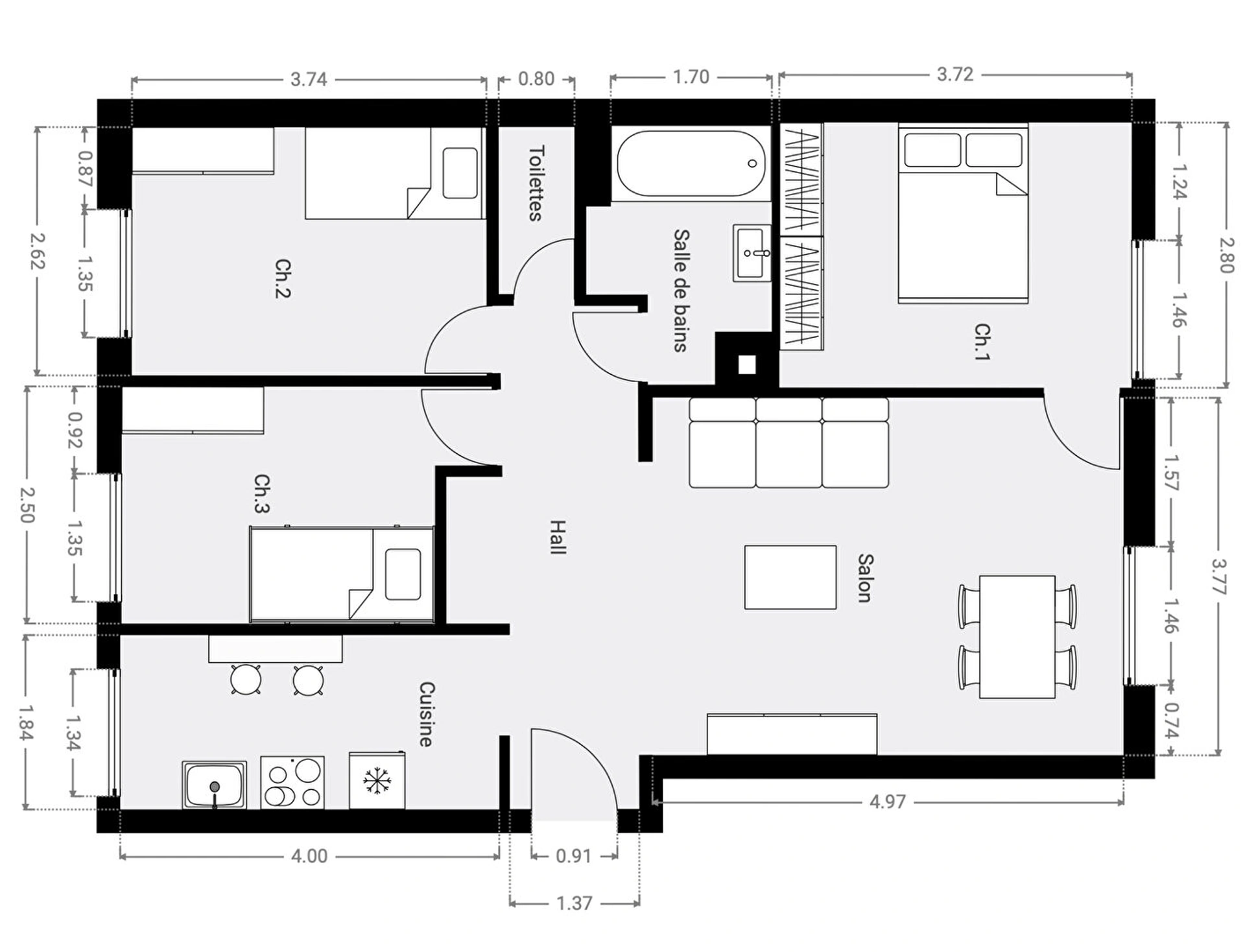 Il se compose d'une entrée accueillante, d'un séjour chaleureux, de trois belles chambres, d'une cuisine indépendante équipée, d'une salle de bains moderne et d'un WC séparé.