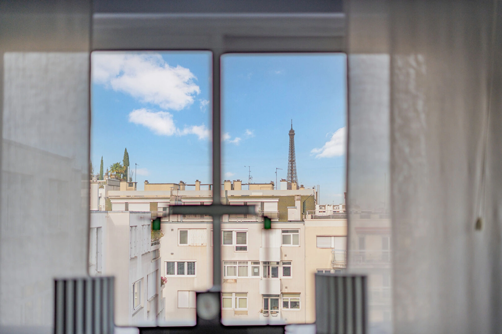 Une entrée élégante ouvrant sur une galerie, une chambre offrant une vue imprenable sur tout Paris, une salle d'eau, une salle de bains, des WC indépendants ainsi que de nombreux rangements.