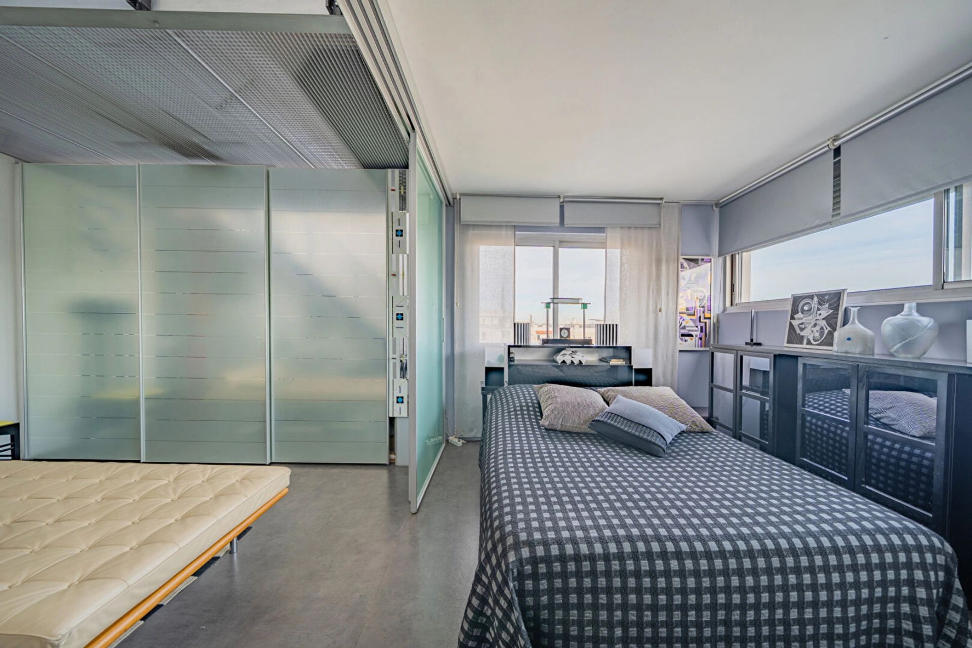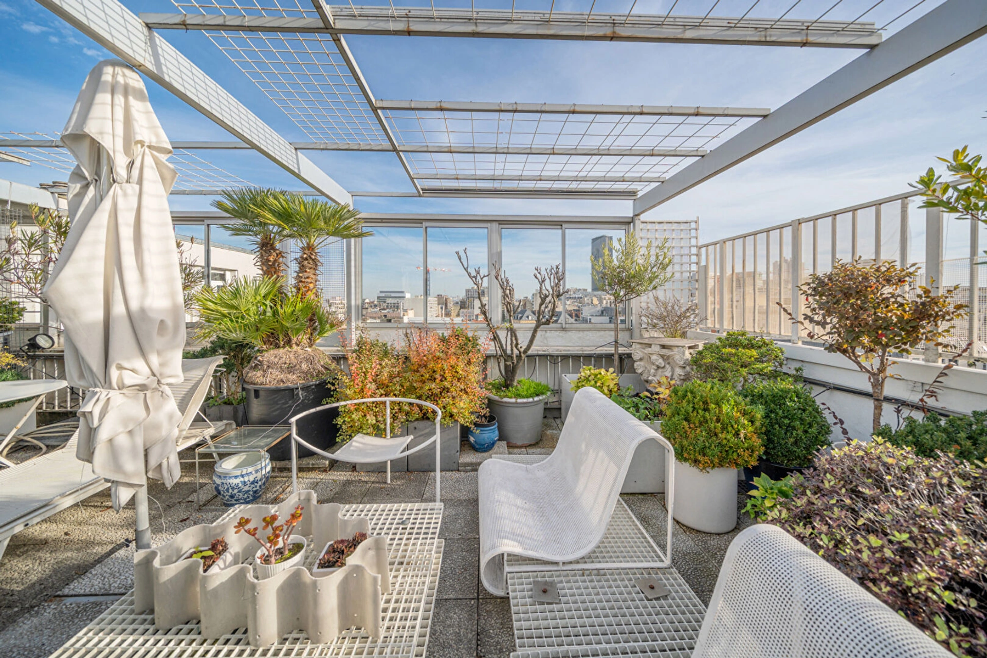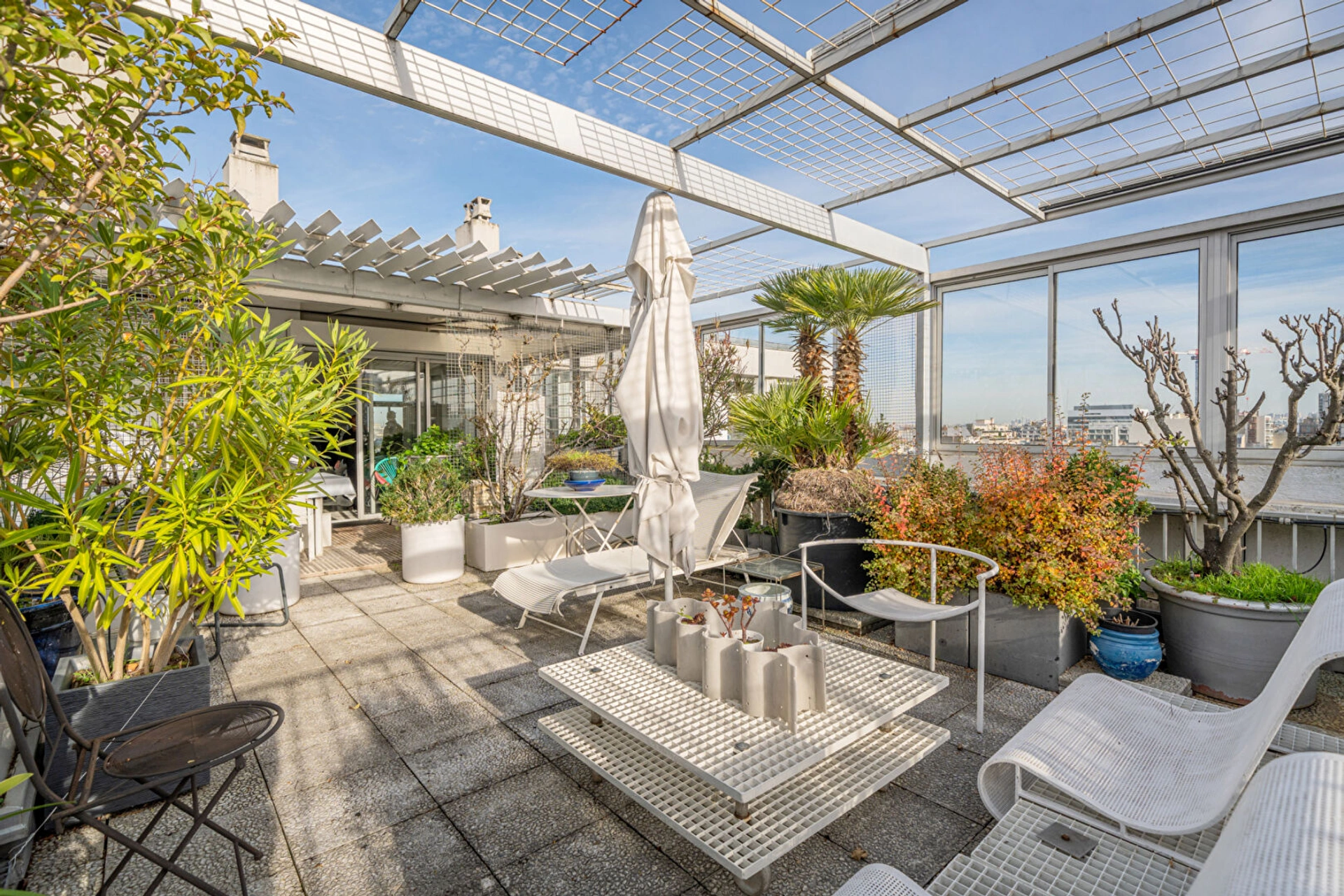 Une entrée élégante ouvrant sur une galerie, une chambre offrant une vue imprenable sur tout Paris, une salle d'eau, une salle de bains, des WC indépendants ainsi que de nombreux rangements.