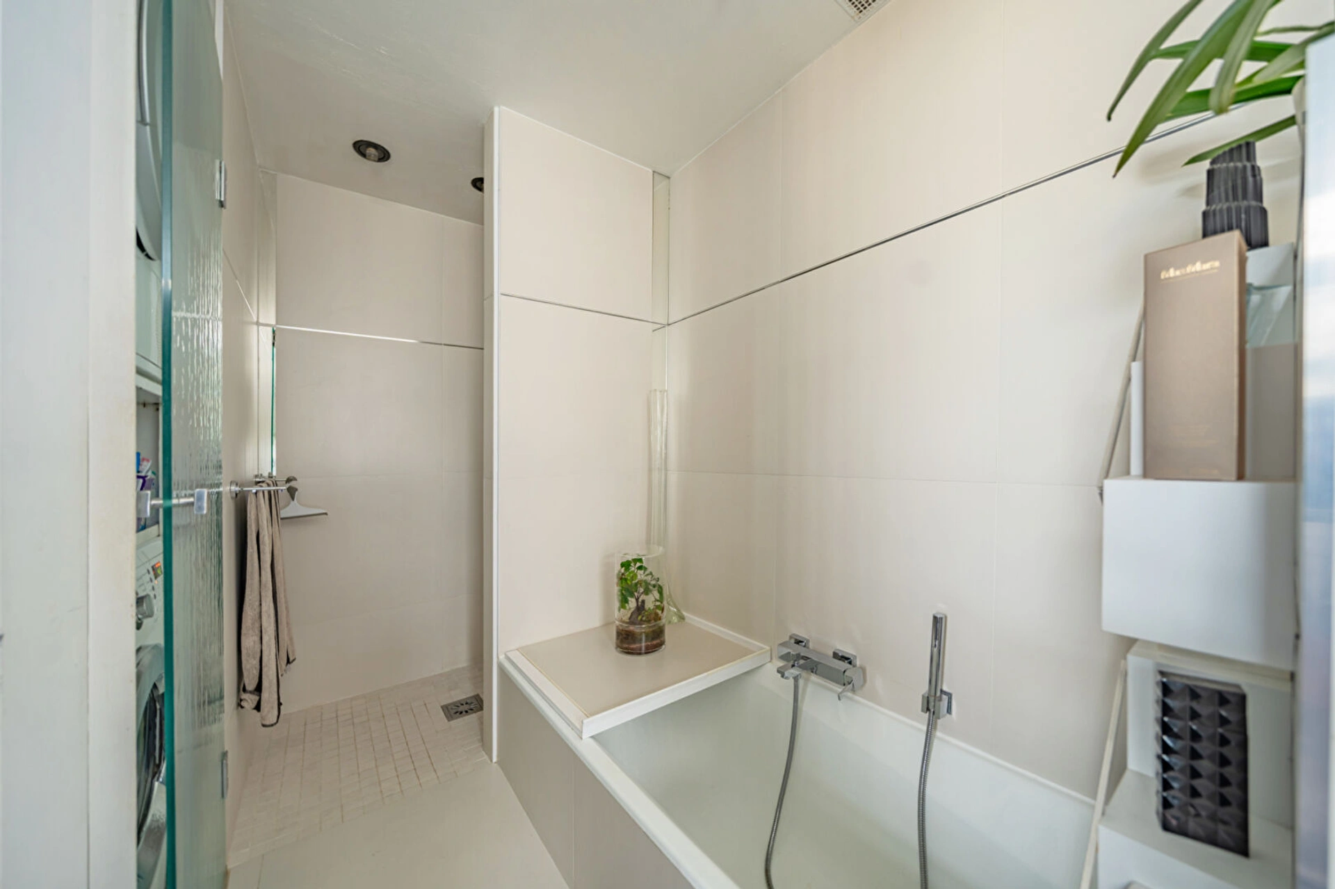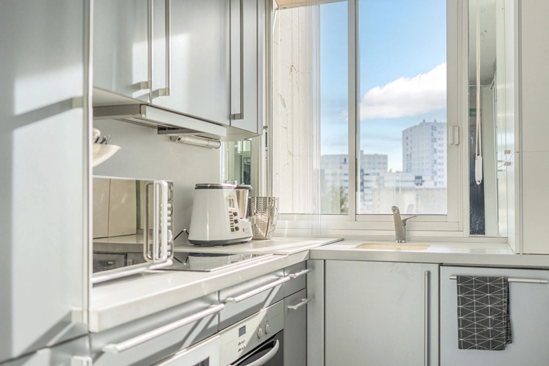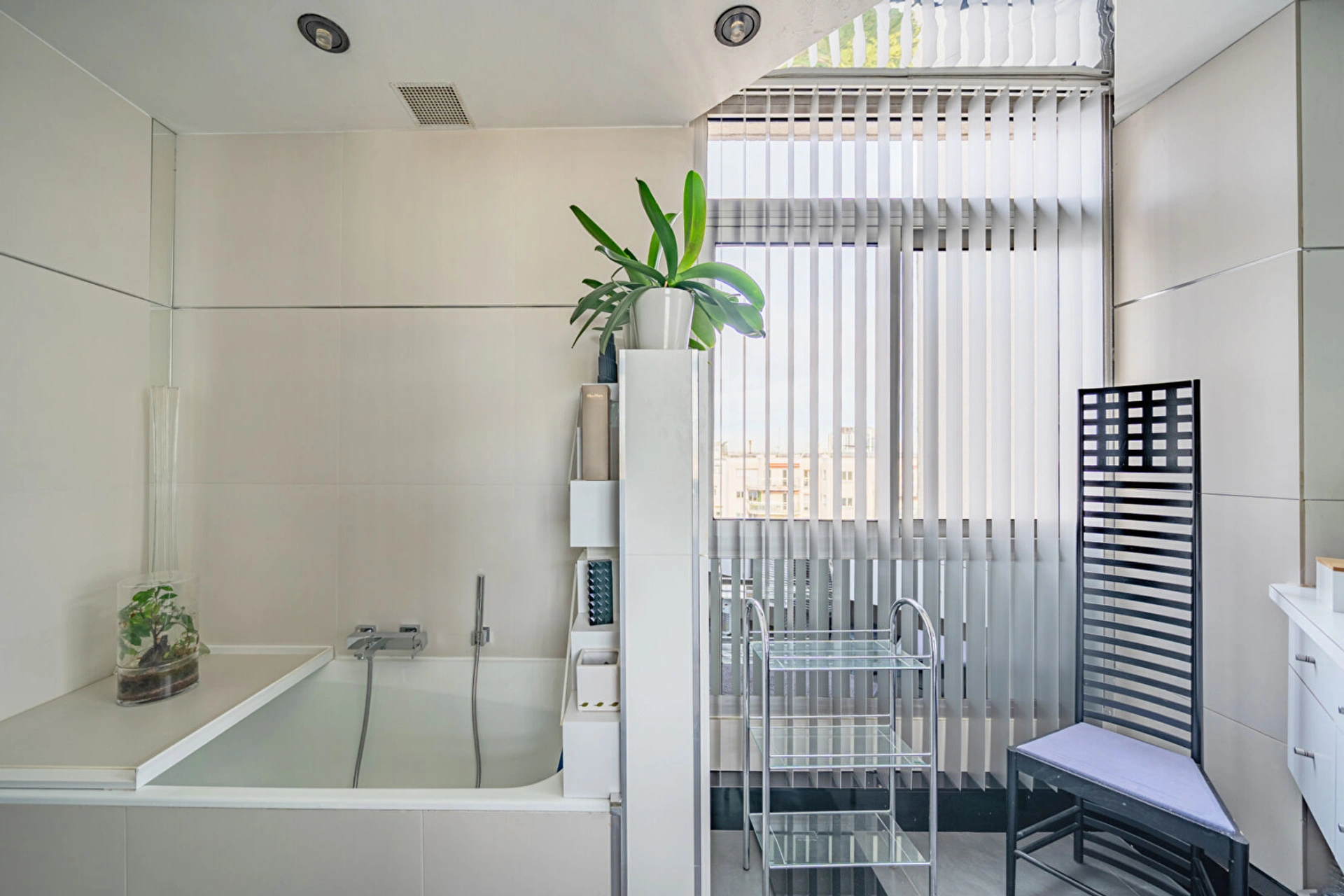Une entrée élégante ouvrant sur une galerie, une chambre offrant une vue imprenable sur tout Paris, une salle d'eau, une salle de bains, des WC indépendants ainsi que de nombreux rangements.