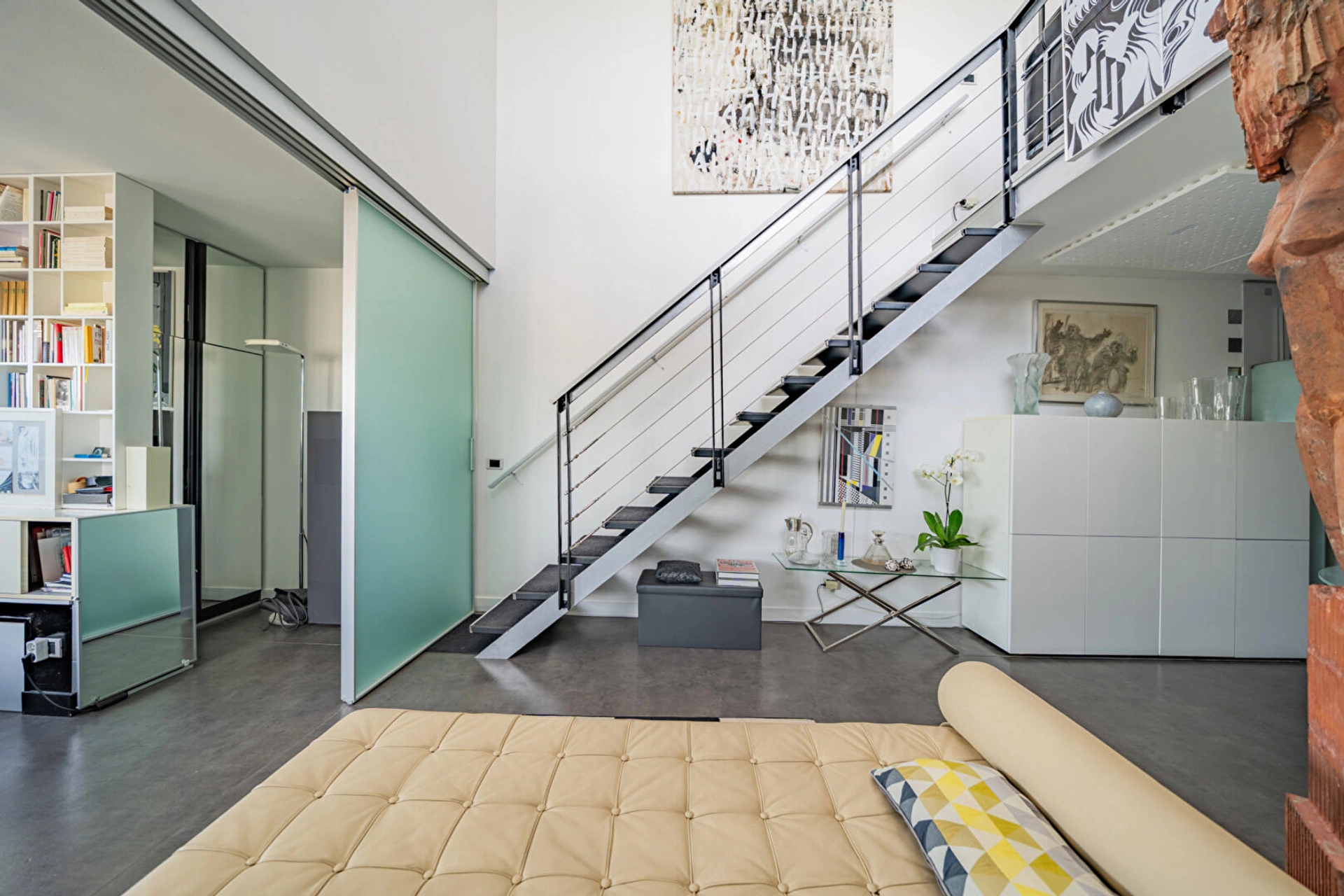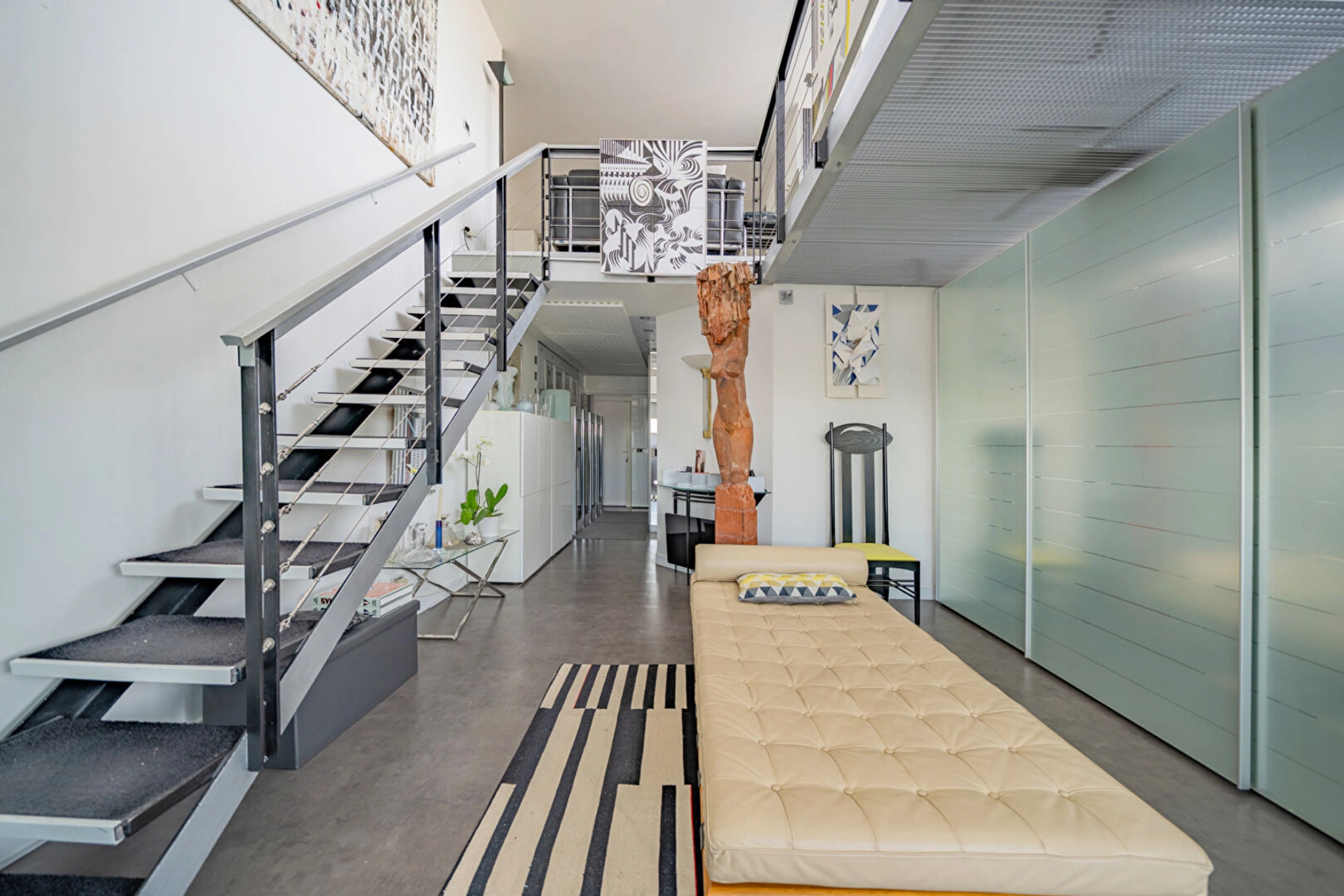 Une mezzanine desservant un vaste salon et une salle à manger baignés de lumière, ouvrant sur une magnifique terrasse arborée de 60 m², une chambre supplémentaire ainsi qu'une cuisine.