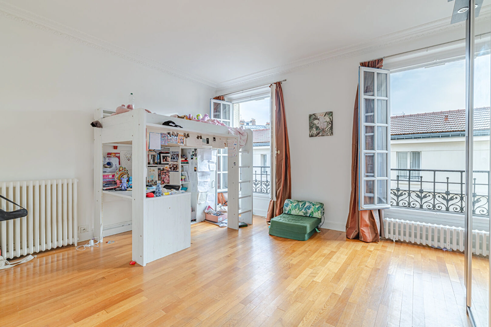 Calme et baigné de lumière, il séduit par le charme de l'ancien parisien : très belle hauteur sous plafond, moulures, parquet en point de Hongrie et cheminées.