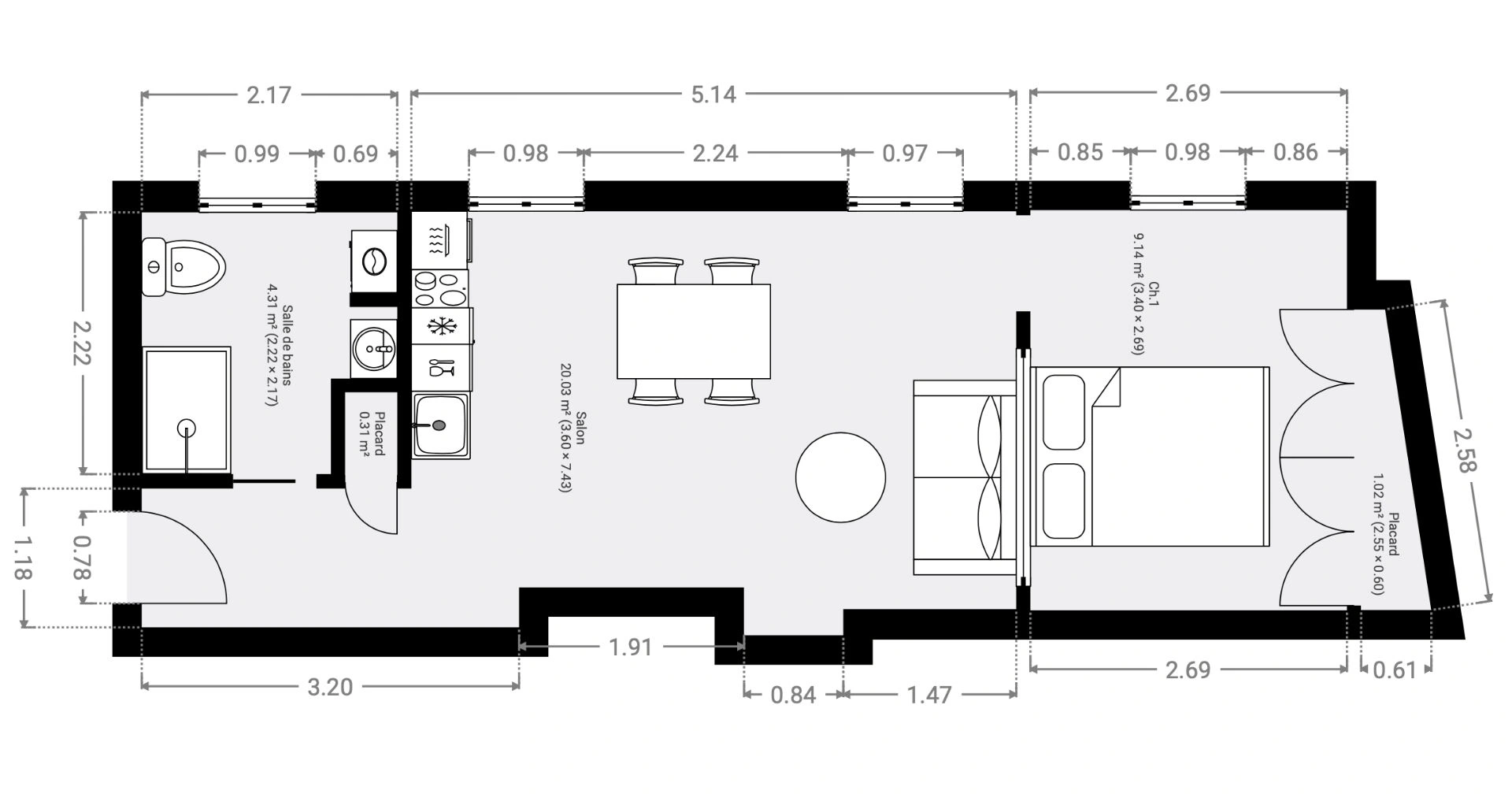 Il se compose comme d'une entrée, d'un grand séjour avec cuisine ouverte, d'une chambre et une salle de douches avec WC.