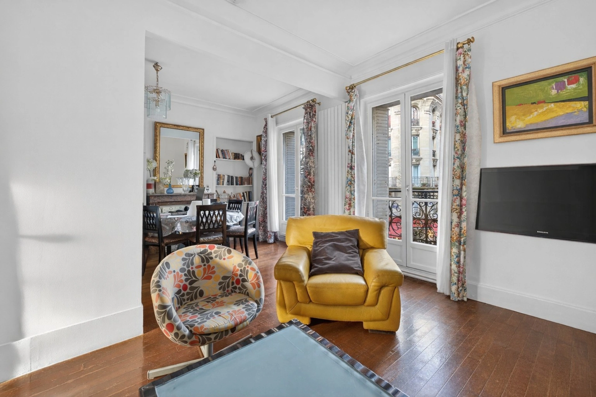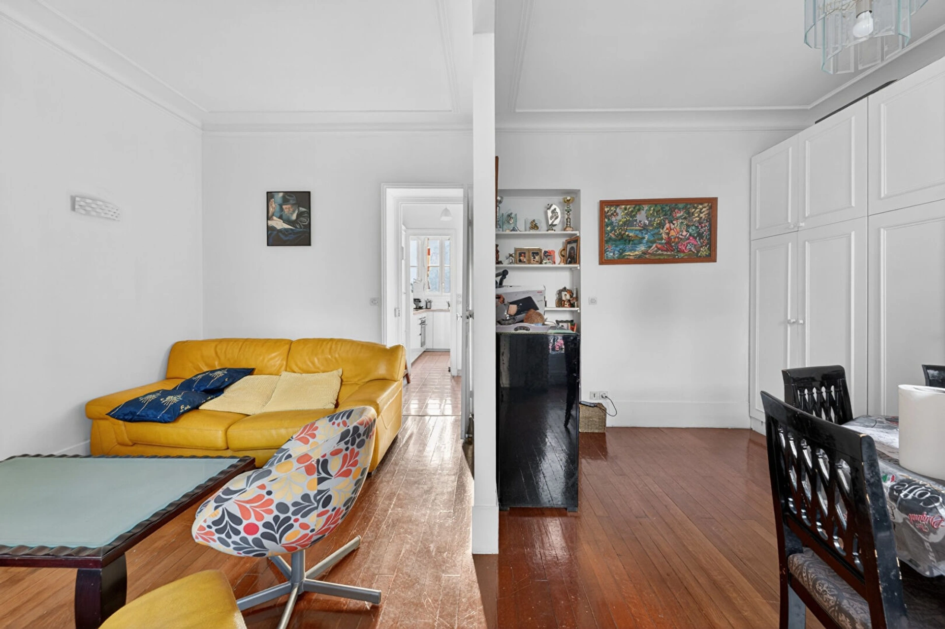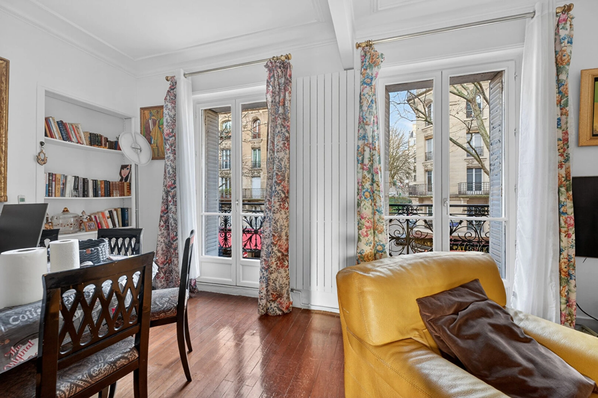 Cet appartement traversant, bénéficiant d'une belle hauteur sous plafond, se compose d'une entrée, d'un séjour et d'une salle à manger, tous deux ouvrant sur un balcon d'environ 3 m².