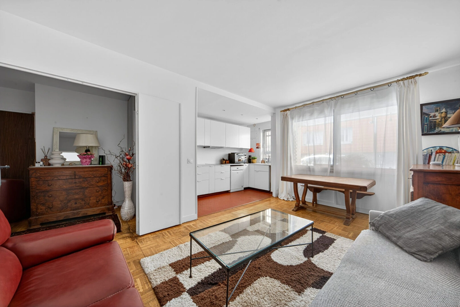 En rez-de-jardin, cet appartement se compose d'une entrée, d'une belle pièce de vie de plus de 23 m² avec cuisine ouverte, aménagée et équipée, idéale pour recevoir.