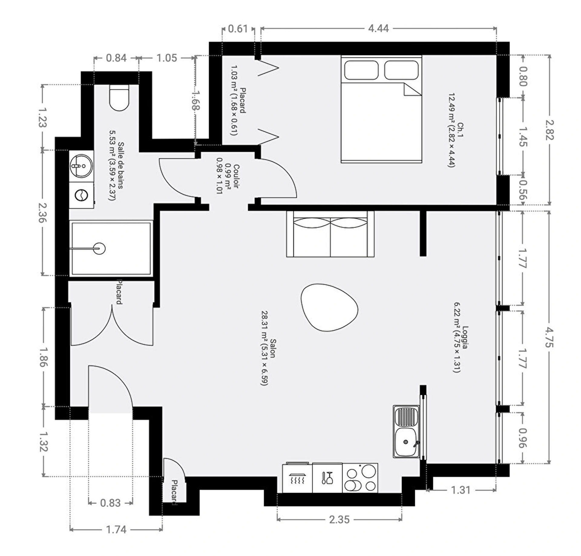 Cet appartement se compose d'une entrée avec placards intégrés, d'un séjour, d'une cuisine semi-ouverte avec un bar, d'une loggia, d'une chambre et d'une salle de douche avec wc.