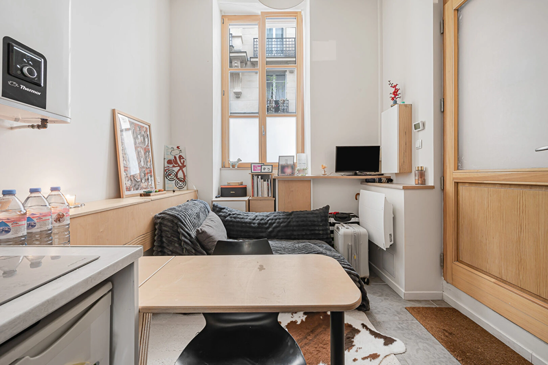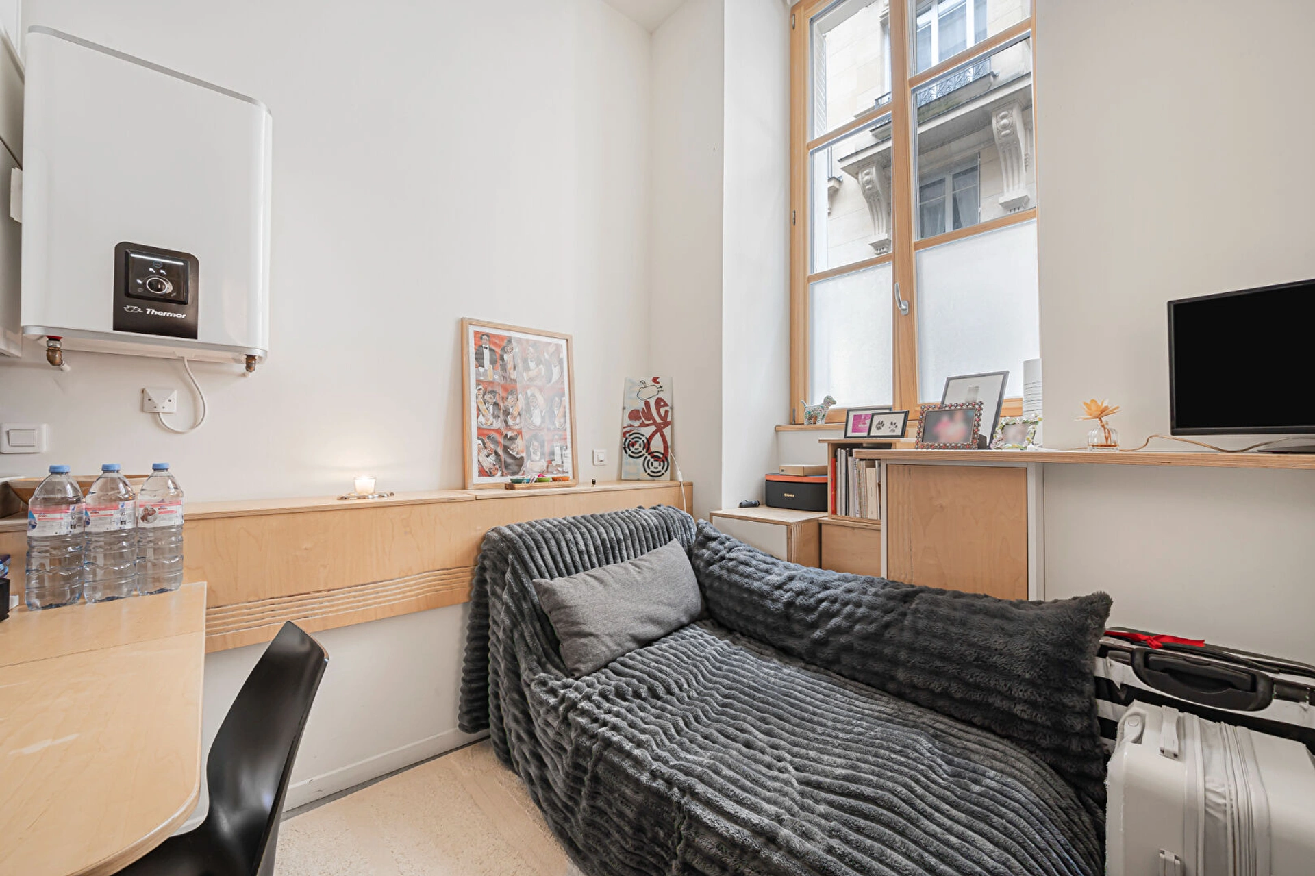 Situé rue des Arquebusiers, dans une rue calme du Marais, à deux pas de la place des Vosges et de la rue de Turenne, ce studio se trouve au sein d'une copropriété bien entretenue.