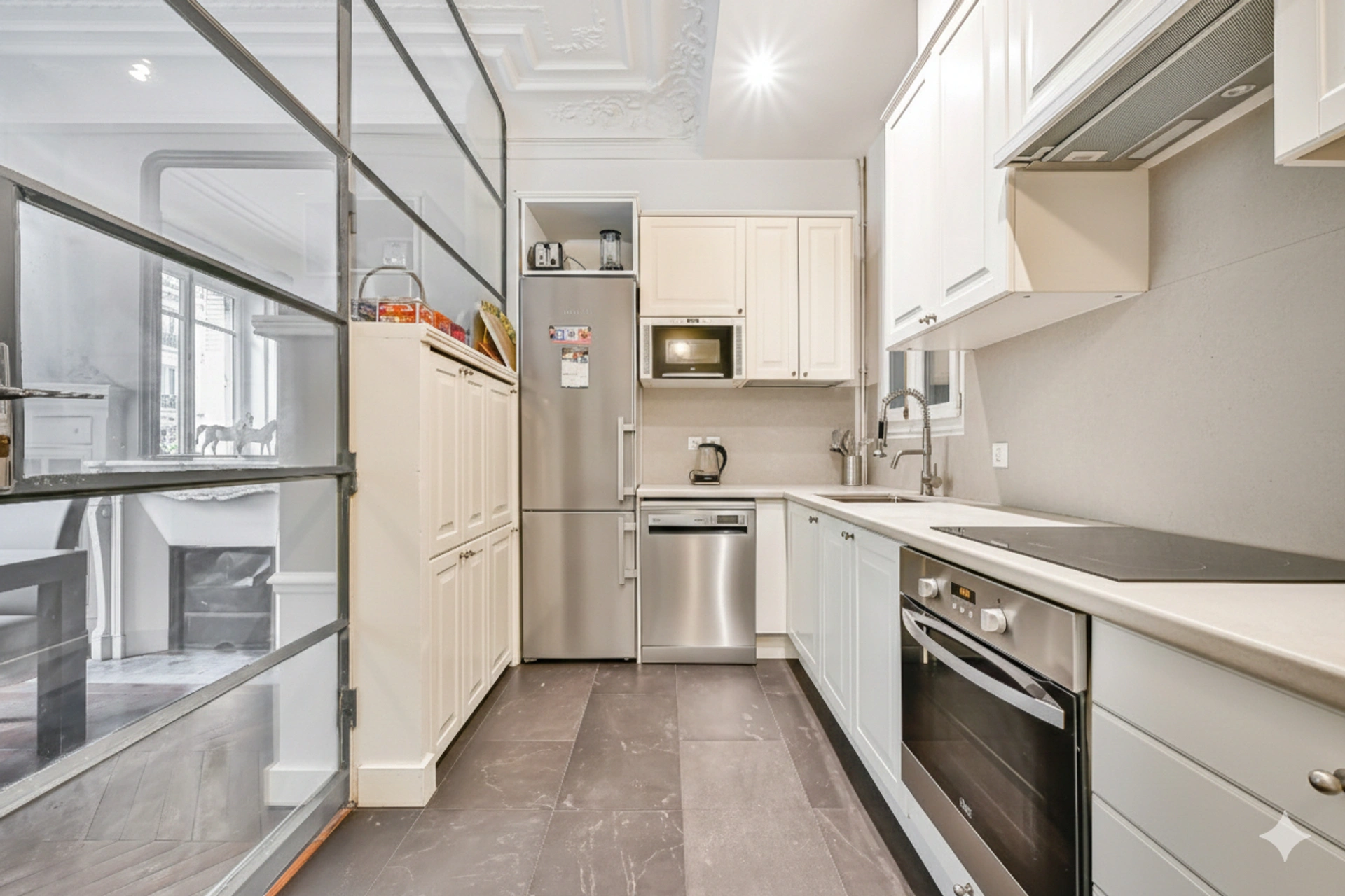 S'ensuit la salle à manger également pourvue d'une belle cheminée - et sa cuisine qui a été séparée par une verrière structure métal, pensée par architecte.