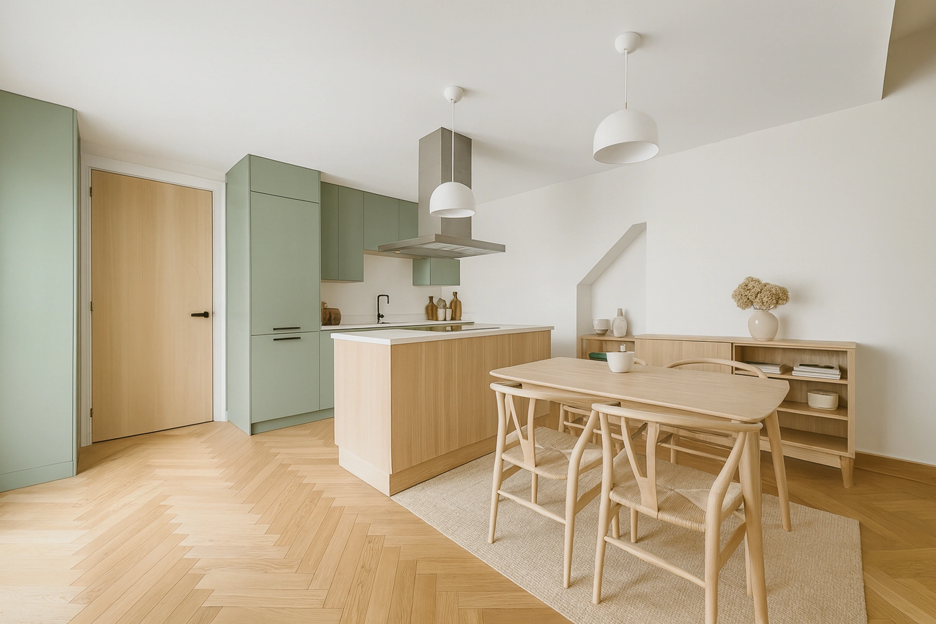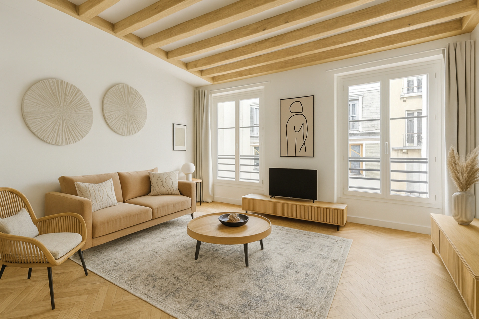 On entre sur une belle pièce de vie avec une cuisine ouverte avec son ilot qui a la double fonction cuisine/salle à manger. Un séjour sur rue avec 2 grandes fenêtres qui peut s'ouvrir sur cette première pièce double fonction et offrir plus de 32m2.