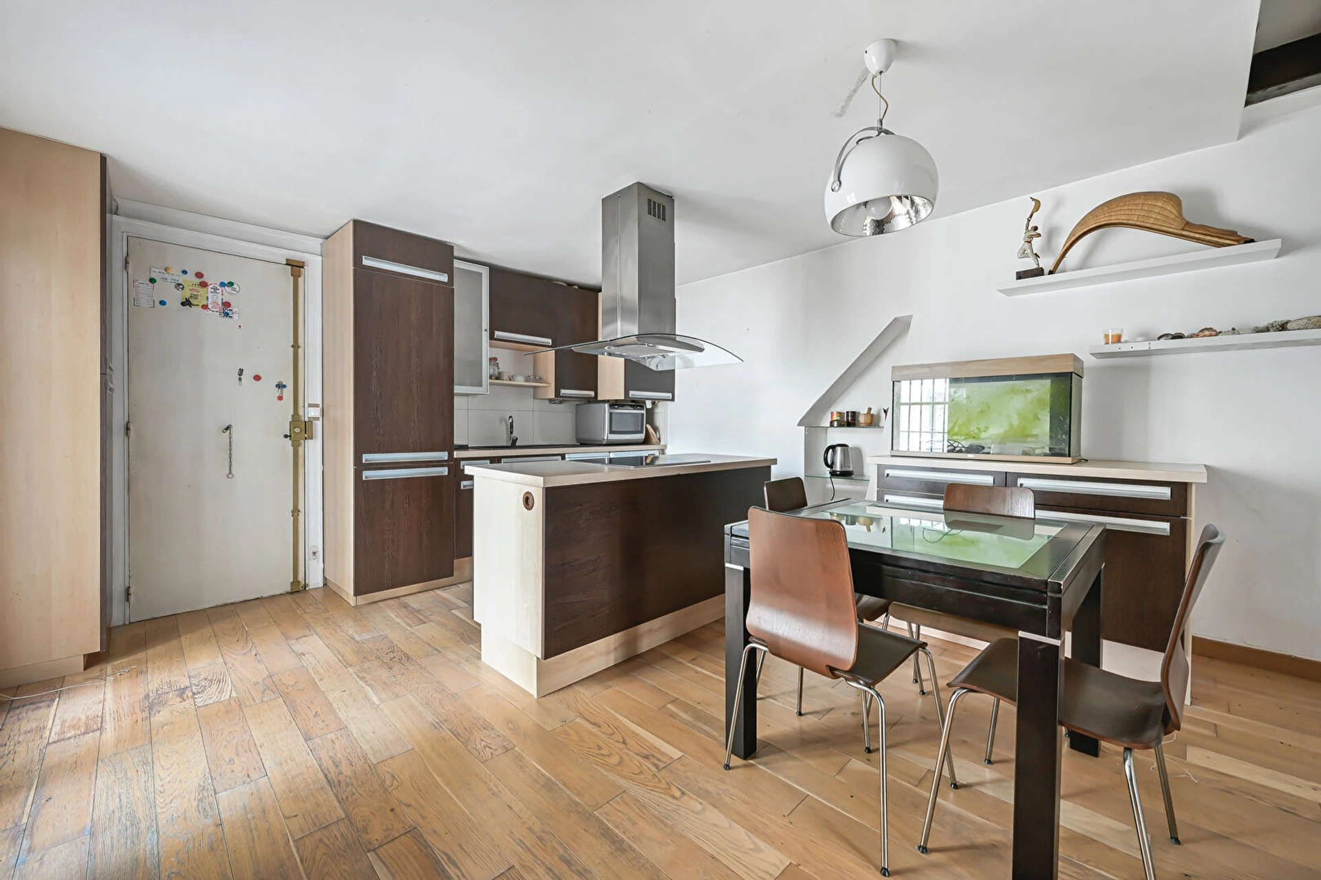 On entre sur une belle pièce de vie avec une cuisine ouverte avec son ilot qui a la double fonction cuisine/salle à manger. Un séjour sur rue avec 2 grandes fenêtres qui peut s'ouvrir sur cette première pièce double fonction et offrir plus de 32m2.