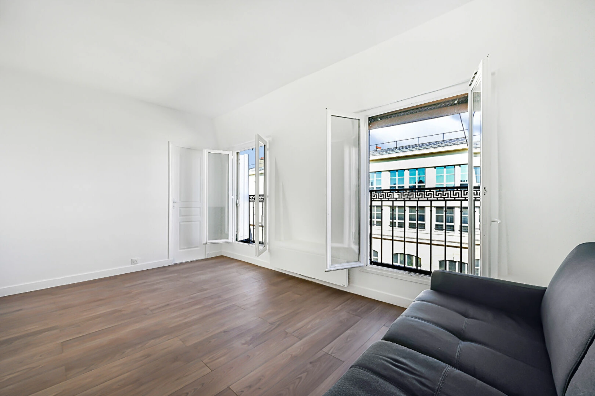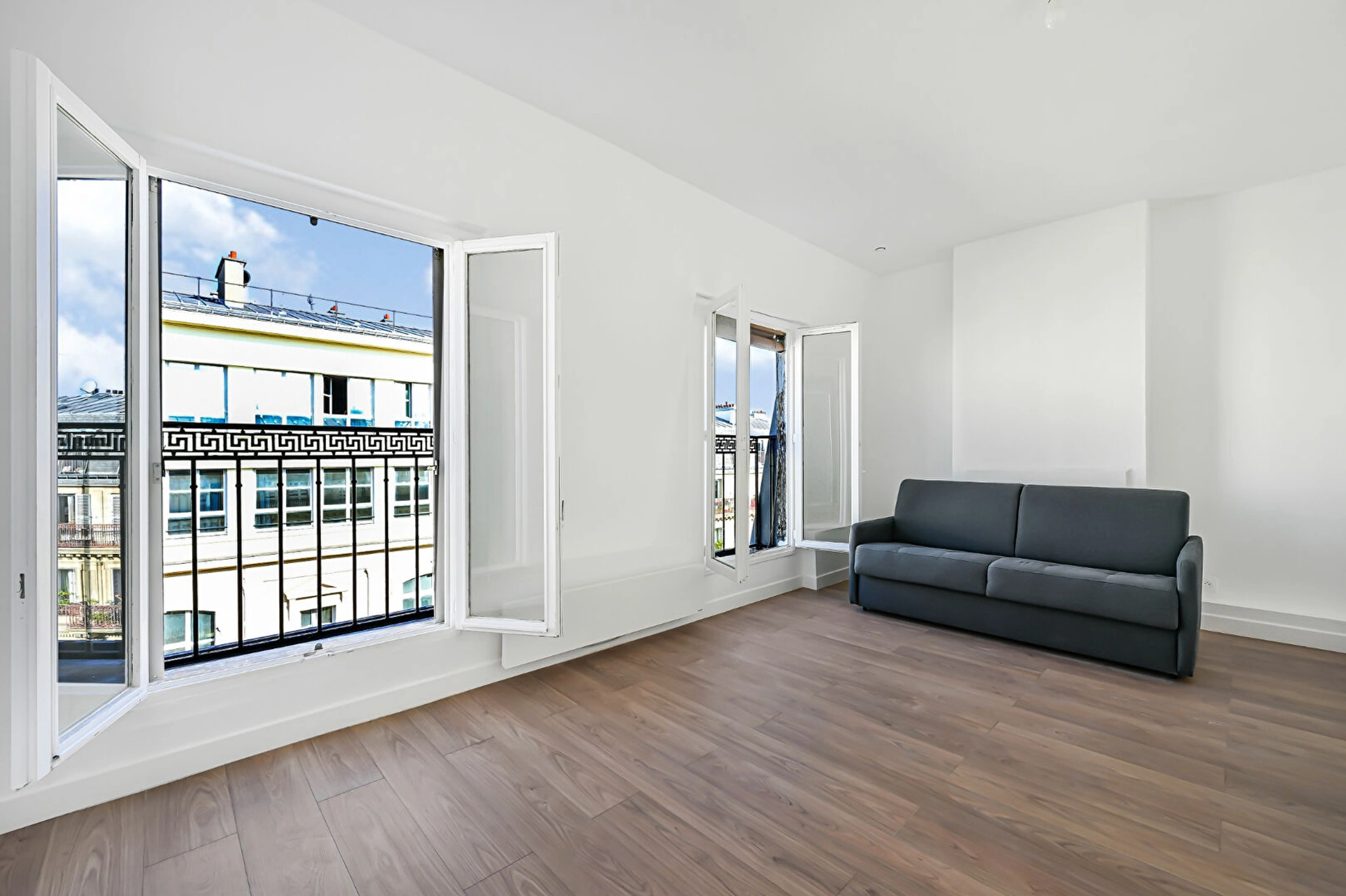The apartment features a sunny living area 18m2, an open kitchen, a bedroom of 9,5m2 (currently being renovated - photo is a projection), and a modern bathroom with toilet. Enjoy the Paris skyline from three bigs windows