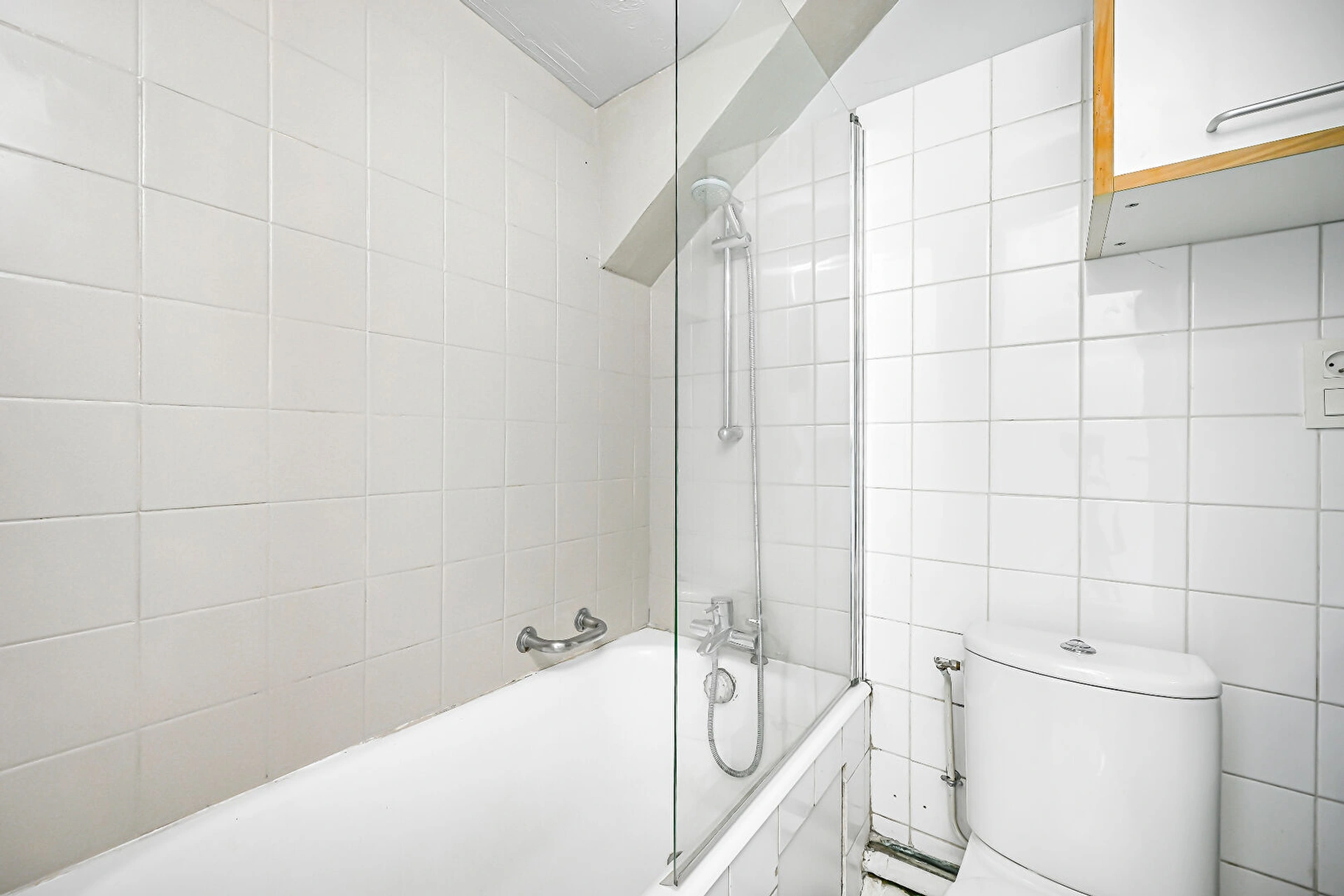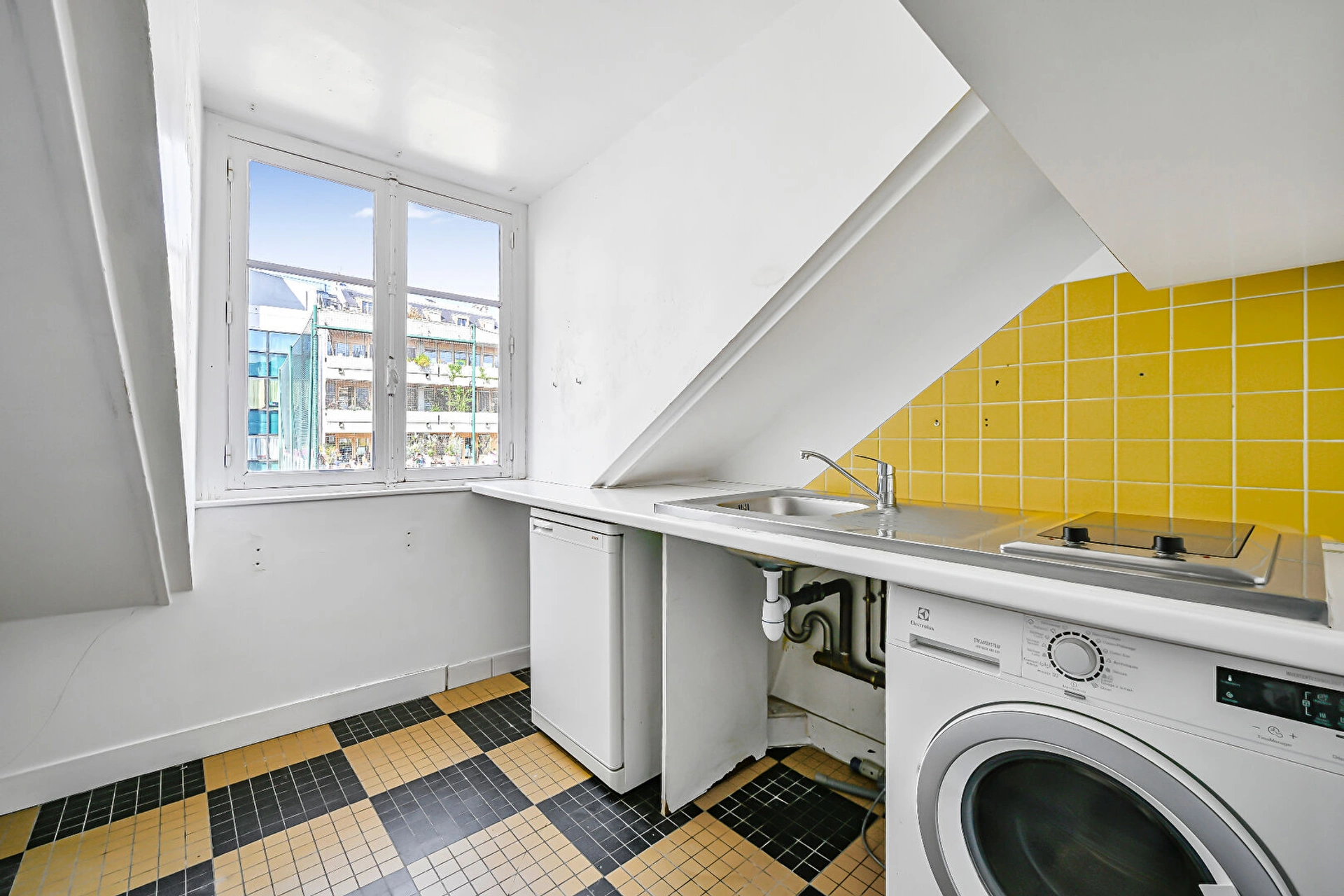 Dès l'entrée, vous trouverez une salle de bains avec WC ainsi qu'une cuisine indépendante avec une vue sur le centre Beaubourg.