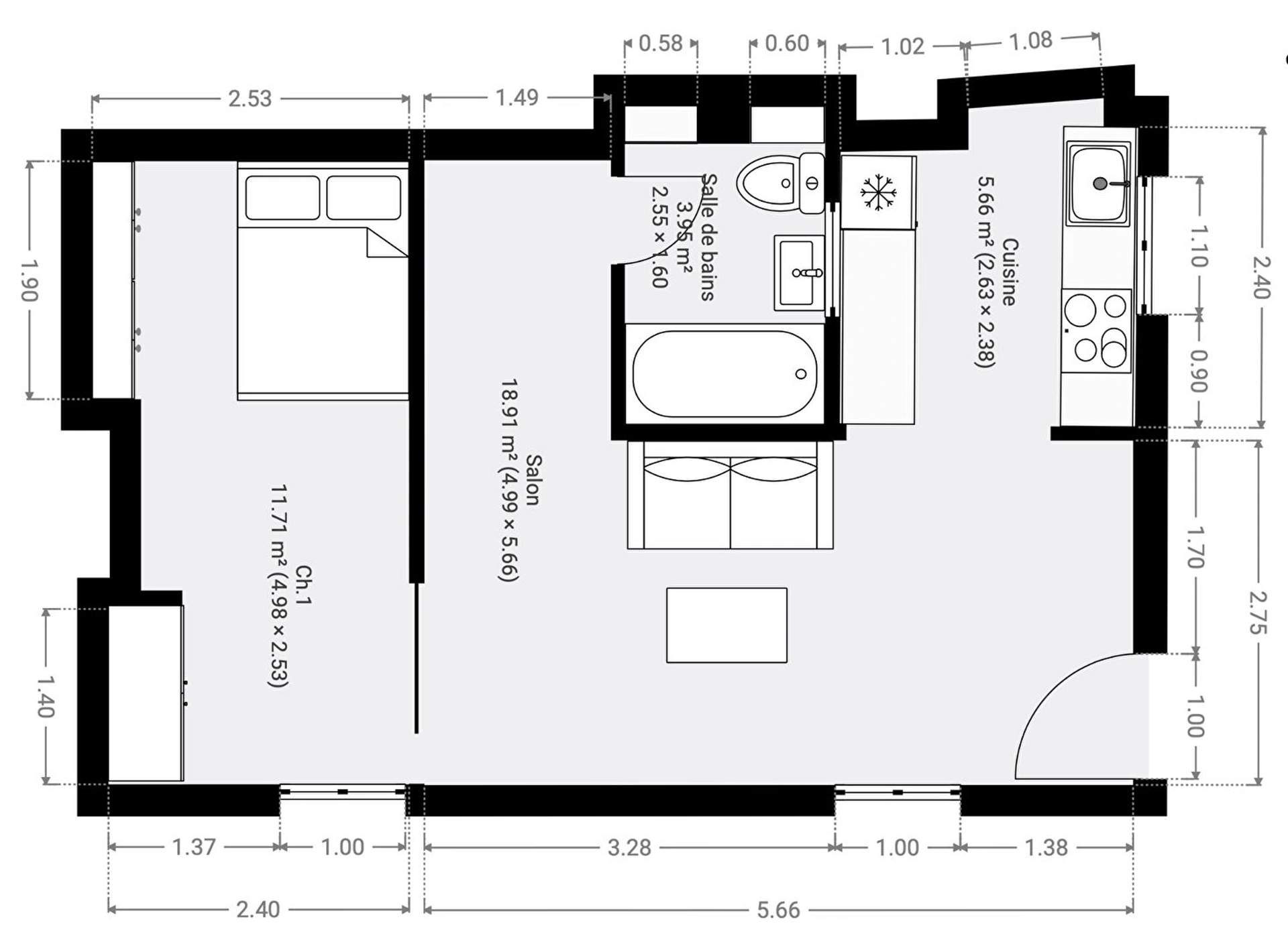 L'appartement, en excellent état, se compose d'une belle pièce de vie de près de 19m2 , d'une cuisine ouverte, d'une chambre au calme et d'une salle d'eau avec WC.