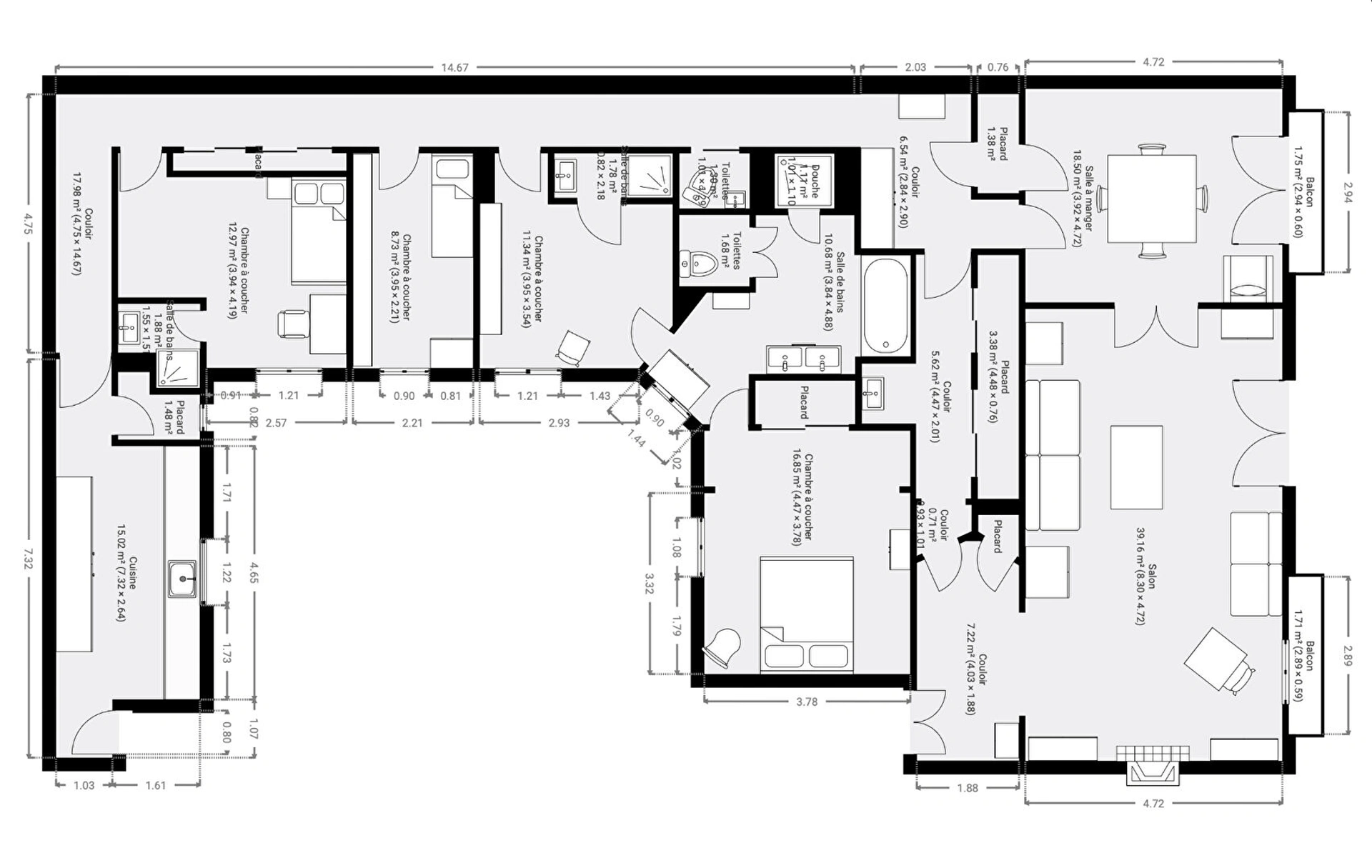 4 belles chambres dont une suite parentale de 18m2 avec salle de bains (baignoire et douche à l'italienne plus WC) auxquelles s'ajoutent une buanderie, un dressing, deux autres salles de douche et des toilettes invités.
