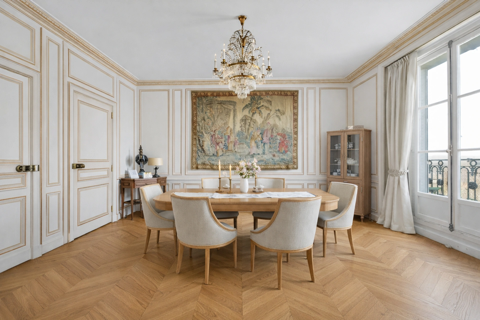 Une entrée, un magnifique séjour/salle à manger de 62m² aux boiseries en chênes sculptées et cheminée fonctionnelle en marbre.