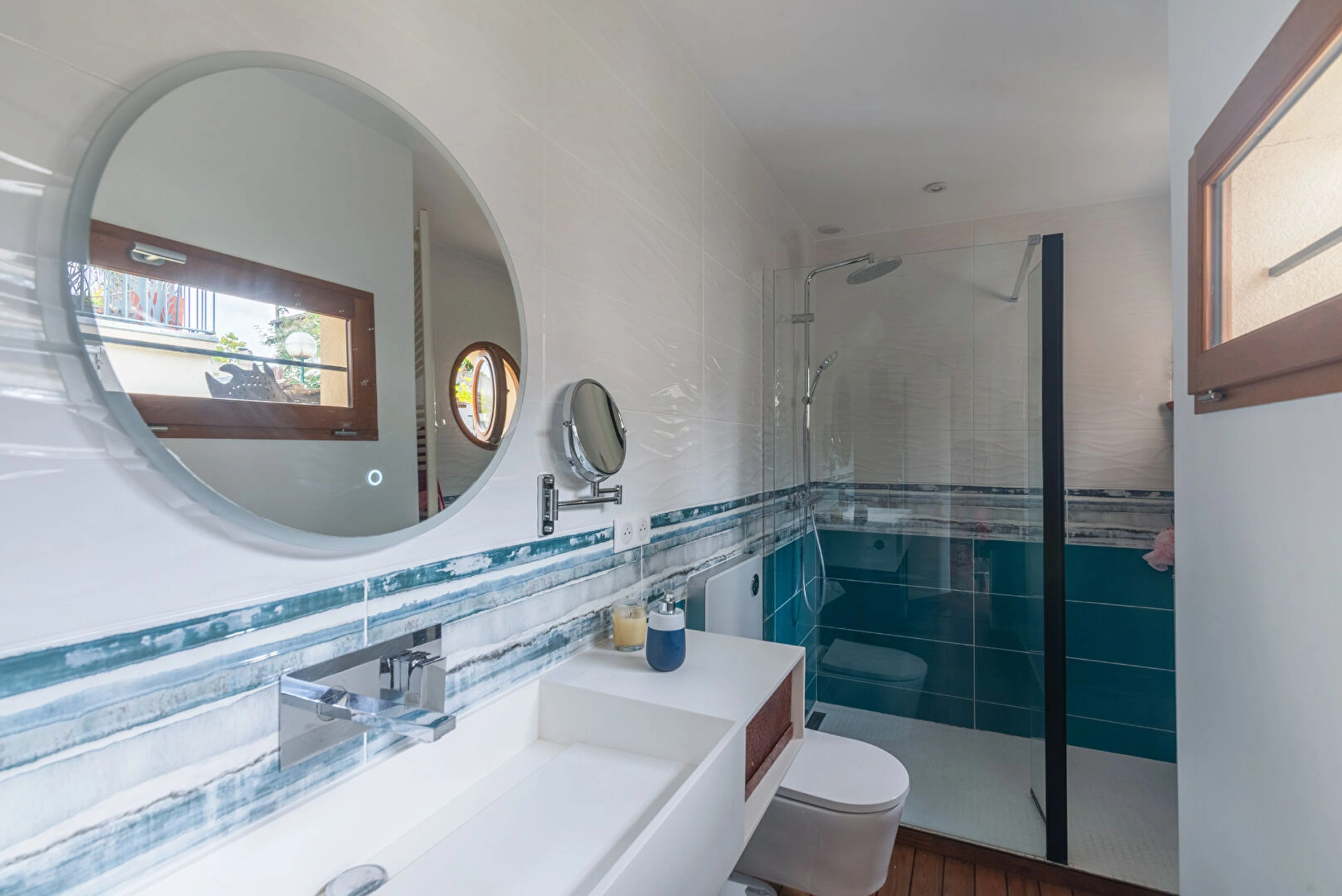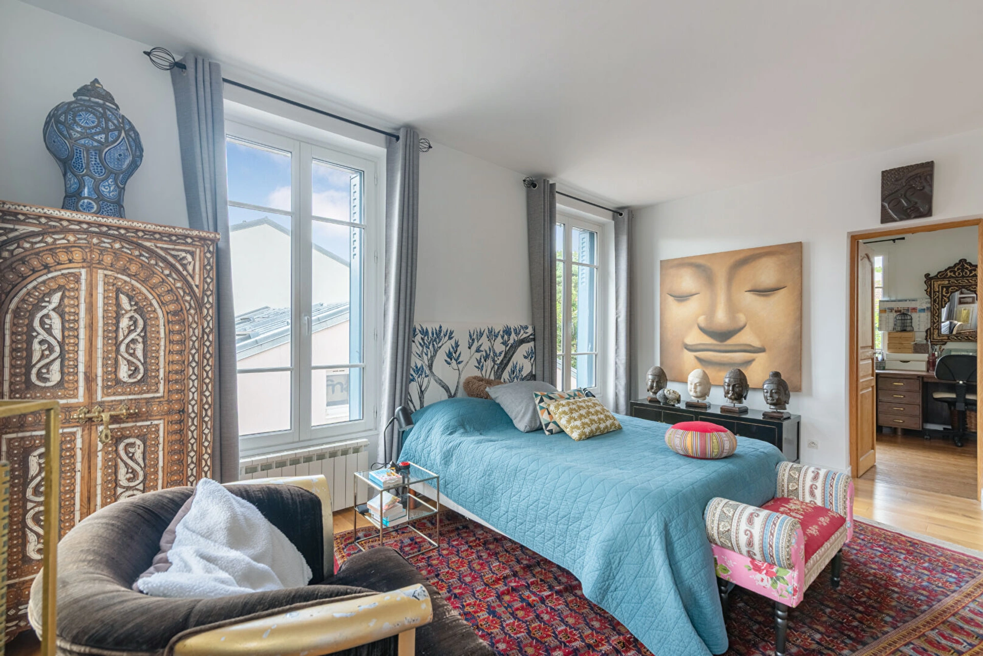 A l'étage, l'espace nuit déploie trois belles chambres, dont une magnifique suite parentale avec sa propre salle de bains et un bureau attenant. La suite se distingue surtout par sa terrasse privative de 10 m², un véritable havre de paix suspendu où l'on profite du calme environnant.