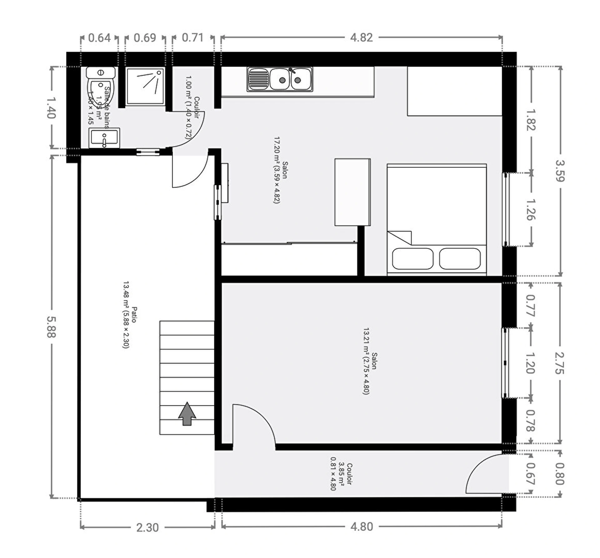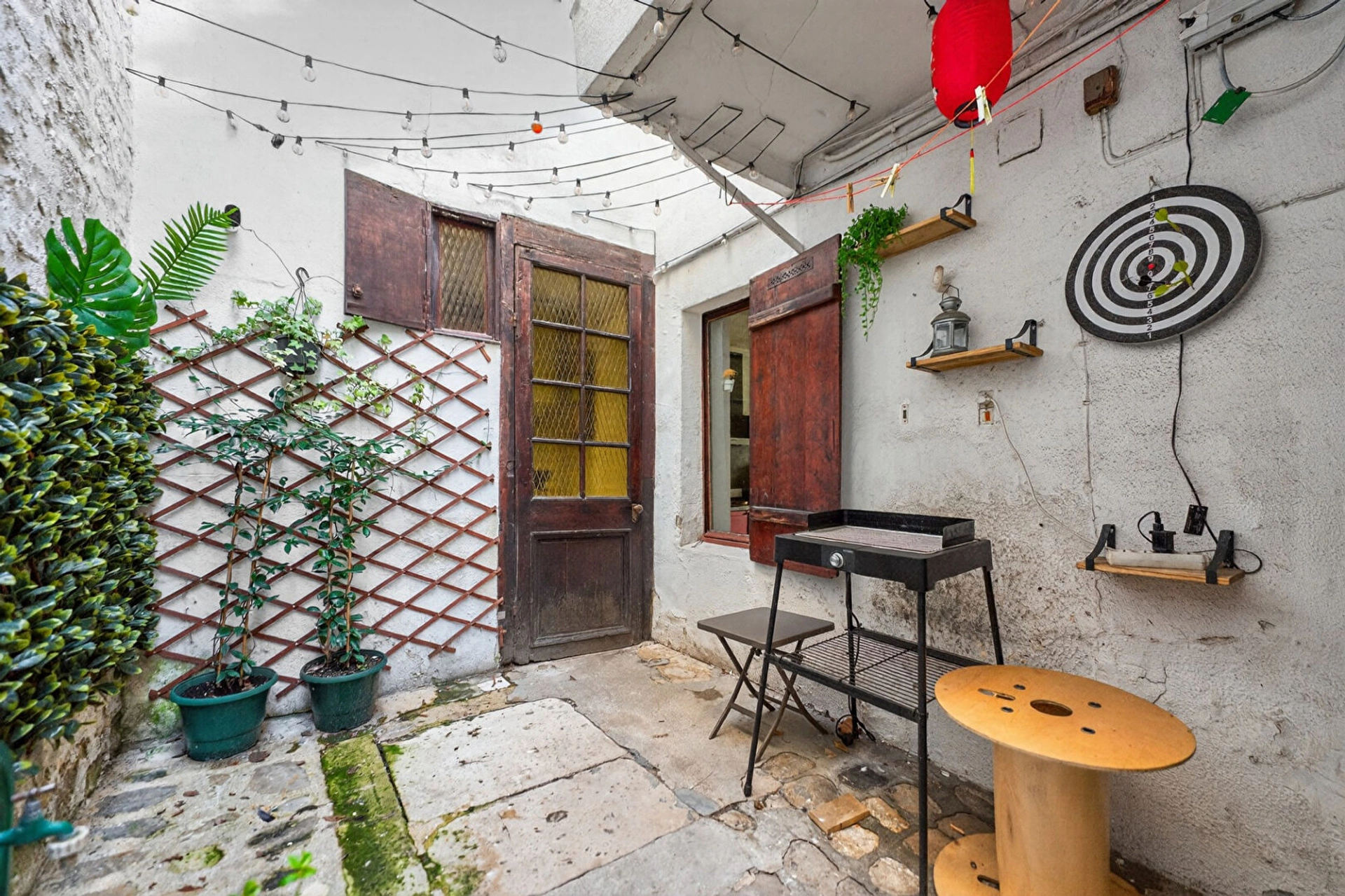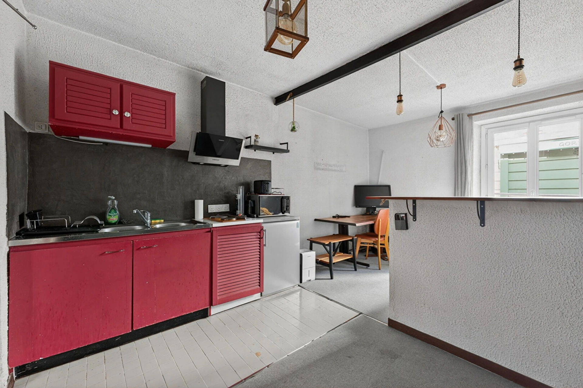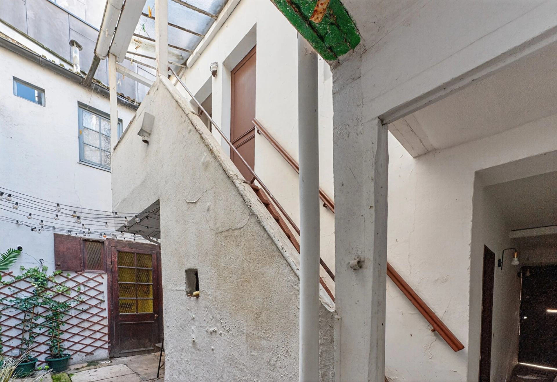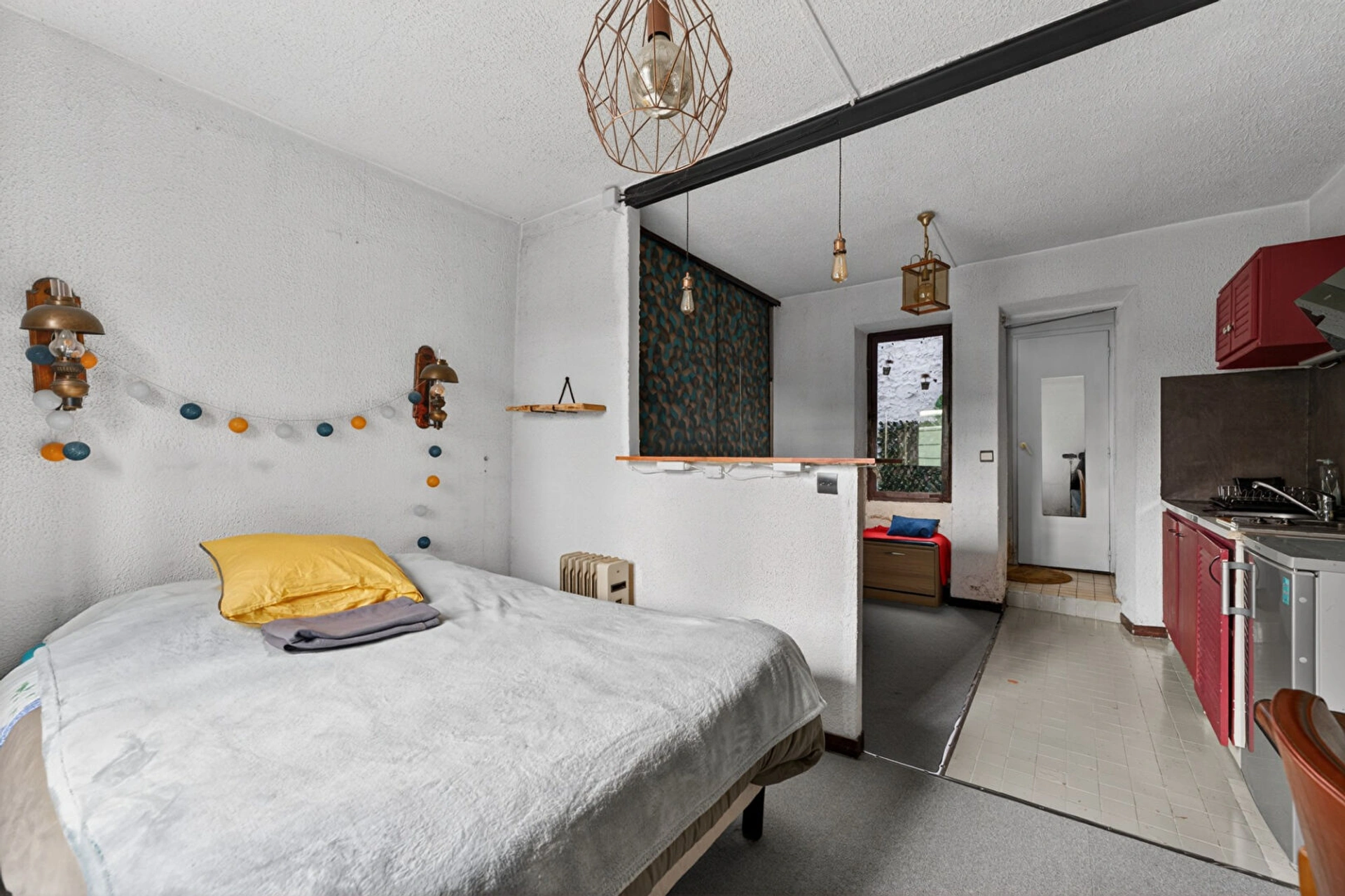 Au rez-de-chaussée, une cour comprenant deux entrées pour accéder au logement constitué d'un hall, un studio aménagé avec cuisine ouverte, une salle d'eau avec wc, et une chambre à aménager. Le niveau entier peut être réuni pour former un deux pièces.