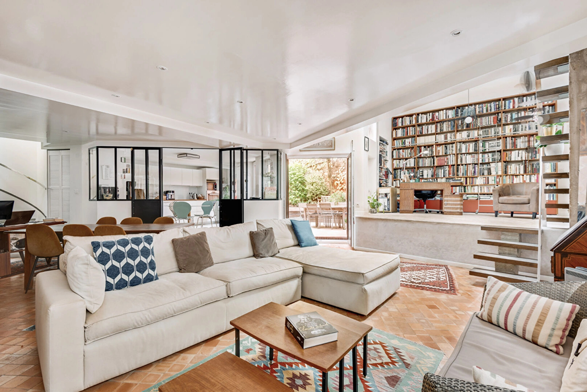Un magnifique et vaste double pièce de vie comprenant un séjour avec cheminée et une salle à manger avec un espace bureau et bibliothèque ainsi qu'une buanderie, un jardin et différents niveaux créant des volumes atypiques, une cuisine dinatoire équipée et aménagée avec verrière et lumineuse ouvrant sur la terrasse et sur le séjour, une suite parentale possiblement indépendante (ancien studio) avec accès terrasse, une salle de bain et des WC indépendants.